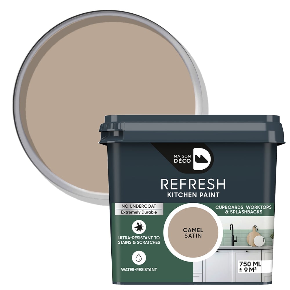 Renovate your whole kitchen without needing to pick up a hammer with Maison Deco Refresh Kitchen Camel Satin Paint 750ml. Refresh Kitchen Paint is specially designed to update high-use surfaces such as cupboards, worktops and splashbacks. It has been developed to withstand all that life can throw at a kitchen, including water, stains and grease. This low VOC paint is suitable over laminate, melamine, wood (bare, varnished, painted), tiles, glass, stainless steel and aluminium. Refresh Kitchen Paint requires no undercoat, adhering directly to difficult surfaces such as tiles and melamine. Simply apply two coats with a short pile roller or brush to easily transform kitchen surfaces. Note: melamine and previously coated wood will require sand before applying. On horizontal surfaces like worktops and on splashbacks, it is essential to apply Refresh Kitchen Extra Strong Varnish for ultimate protection. With a passion for colour and finishes, Maison Deco combines technical know-how and decoration expertise to make renovation projects more than just a dream. The Refresh range allows you to breathe new life into your interiors, inspiring endless possibilities for renovation. Say goodbye to drab and dated decor and Refresh and liven up your home!