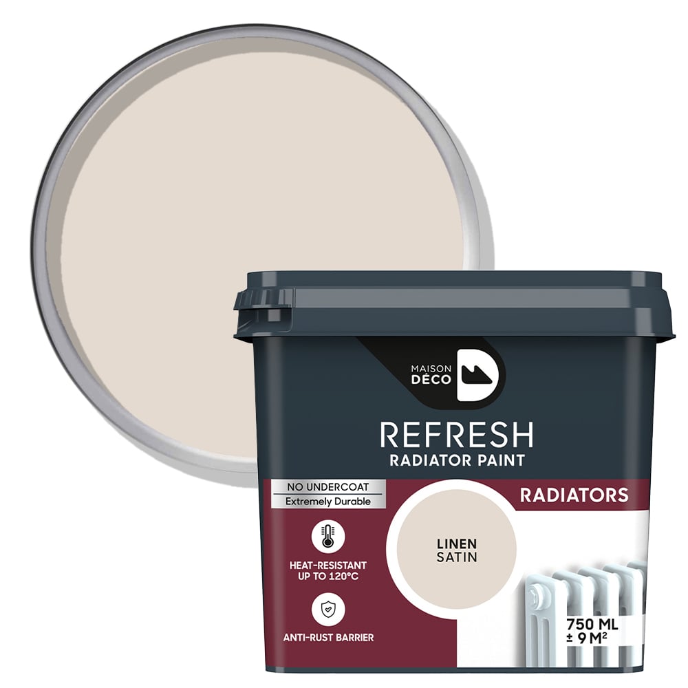 Add those finishing touches to your renovation project with REFRESH RADIATOR PAINT. Specially designed to renovate radiators, towel rails, convector heaters and piping in your home. Its ultra-resistant formula withstands temperatures up to 120°C, forming a protective film against rust that won't yellow or flake. This low VOC paint can be used on all types of metals including Iron, Cast Iron, Aluminium, Steel, Copper. REFRESH RADIATOR PAINT requires no undercoat, simply apply two coats with a short pile roller or brush to easily transform radiators. With a passion for colour and finishes, Maison Deco combines technical know-how and decoration expertise to make renovation projects more than just a dream. The REFRESH range allows you to breathe new life into your interiors, inspiring endless possibilities of renovating. Say goodbye to drab and dated decors, refresh and liven up your home!