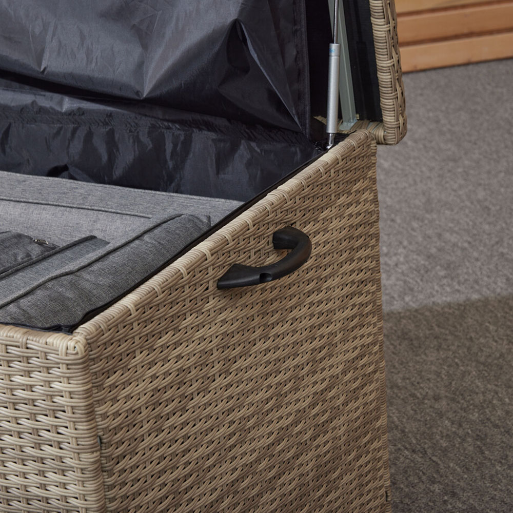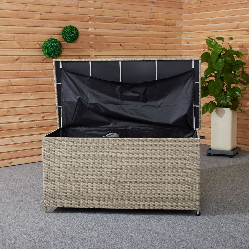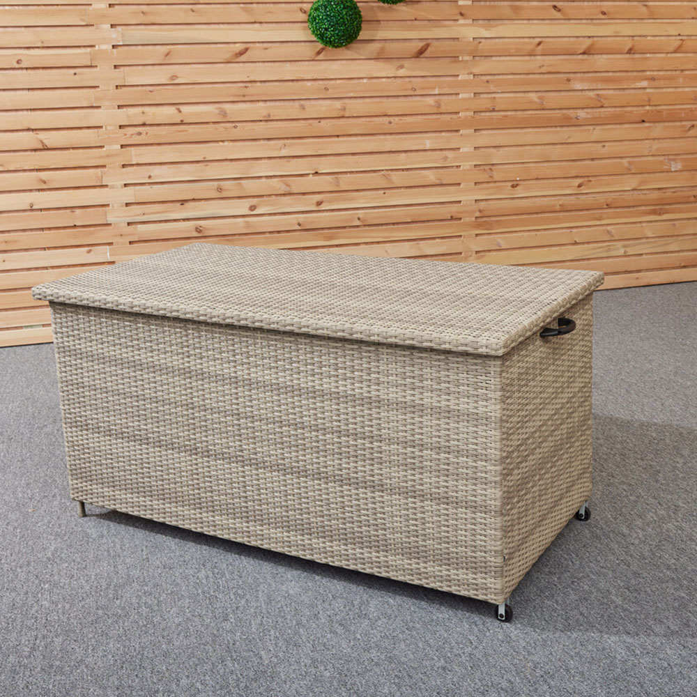 Keep your outdoor space neat and tidy with the Malay Deluxe Cambridge Natural Rattan Effect Cushion Box. It is a practical and stylish solution for storing your garden furniture cushions, covers and other outdoor items. Designed with a sleek rattan-style finish, it goes well with your existing patio furniture. The spacious box is easy to open and close. Plus, the rolling wheels and carry handles make moving it around your garden a breeze.