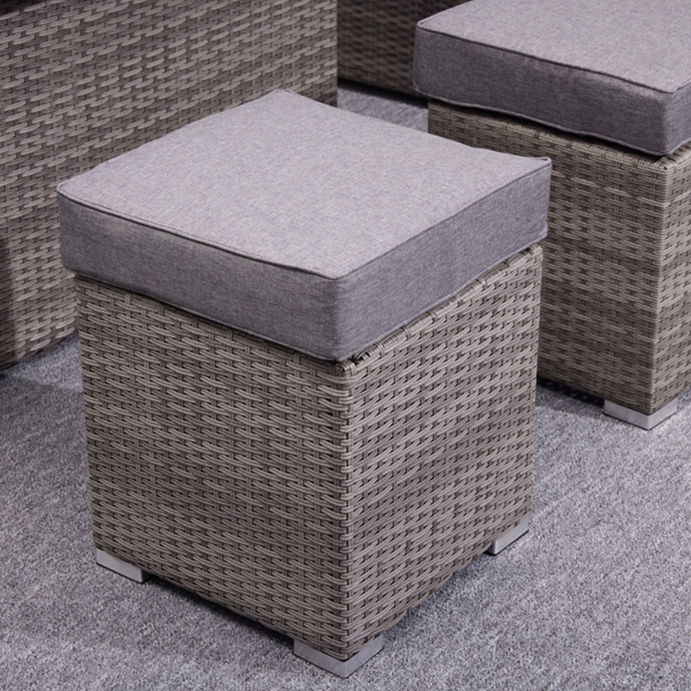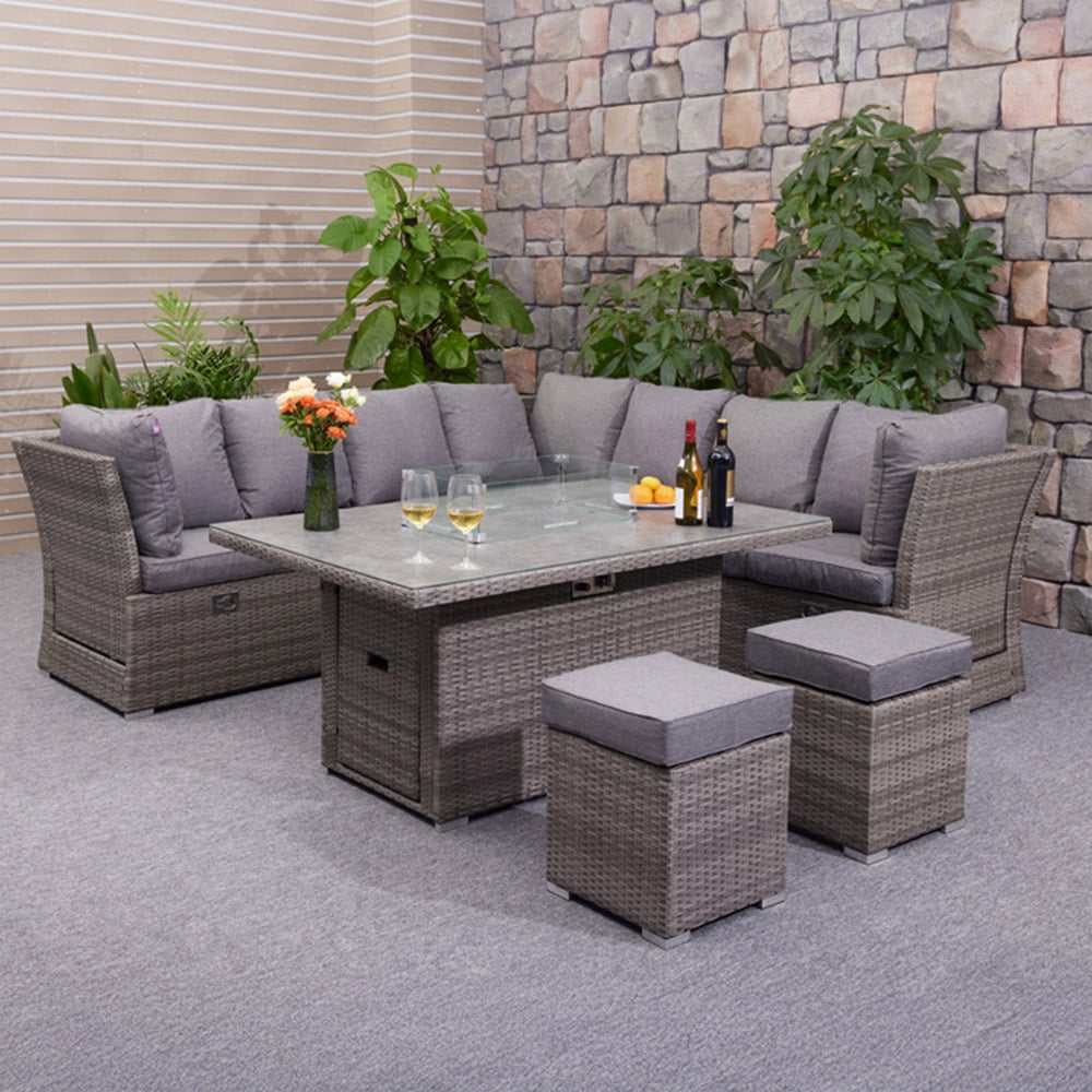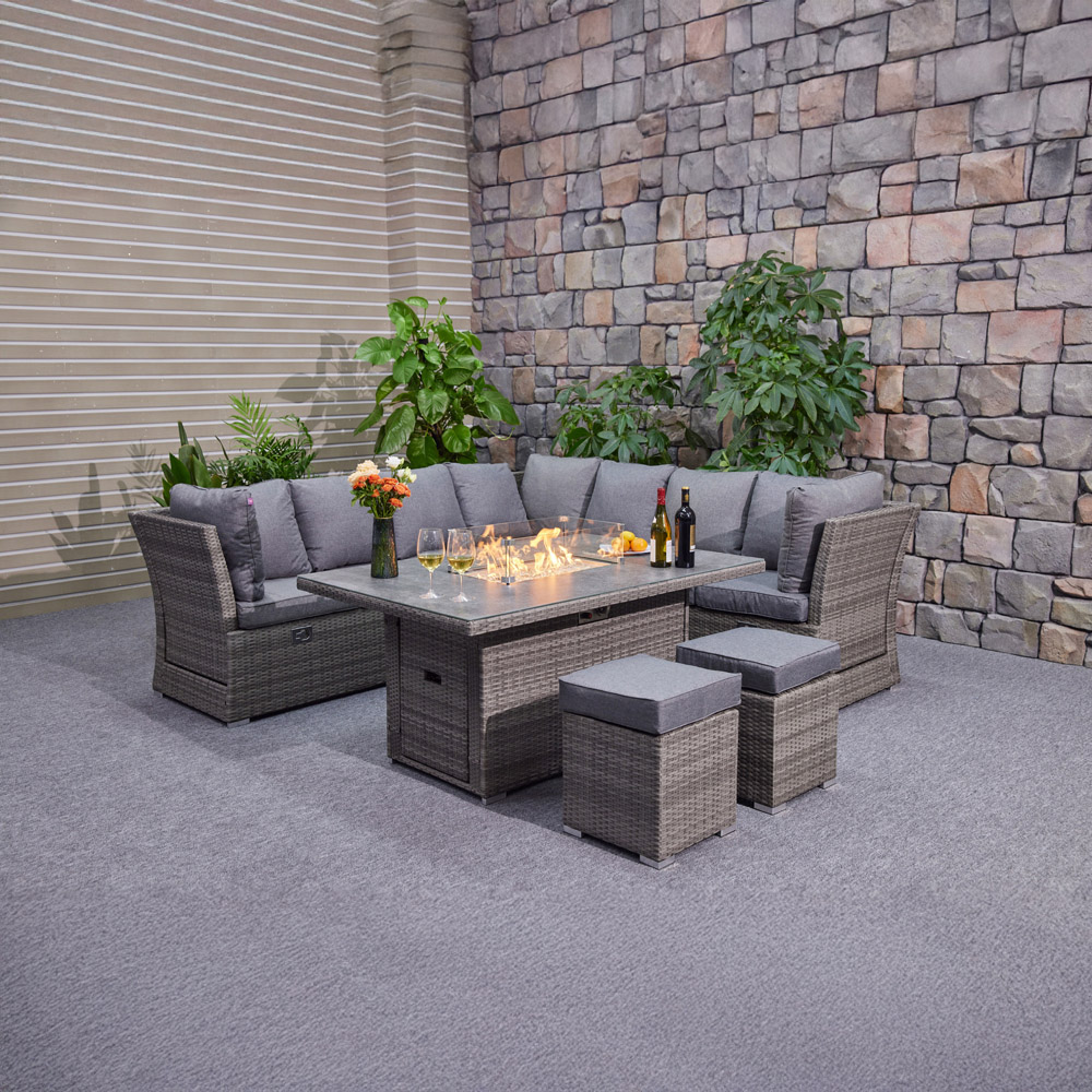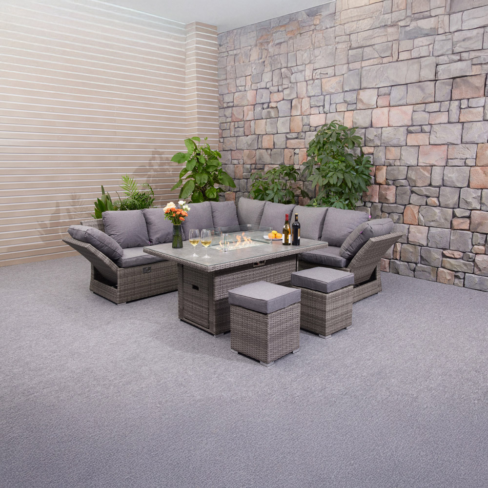 Create unforgettable outdoor experiences with the Malay New Hampshire 9 Seater Grey Wicker Garden Corner Lounge Set with Fire Pit. This exquisite furniture set features a fire pit integrated right into the centre of a rectangular table, easily operated with simple batteries to infuse your outdoor space with cosy warmth. The table boasts a sophisticated ceramic glass top and is encased in a glass safety cage, ensuring a secure environment for everyone to enjoy. With sparkling clear glass beads and two convenient storage compartments on either side, this garden set is designed to impress. Its construction is rust-resistant, UV-resistant, and water-resistant, ensuring durability through the seasons. The luxurious aluminium furniture includes both three-seater and four-seater cushioned sofas that can be combined to create a spacious corner sofa, complete with arm panels that offer multi-angle recliner options. Gather your loved ones around the inviting fire pit and immerse yourselves in the warmth and comfort it brings to your outdoor gatherings.