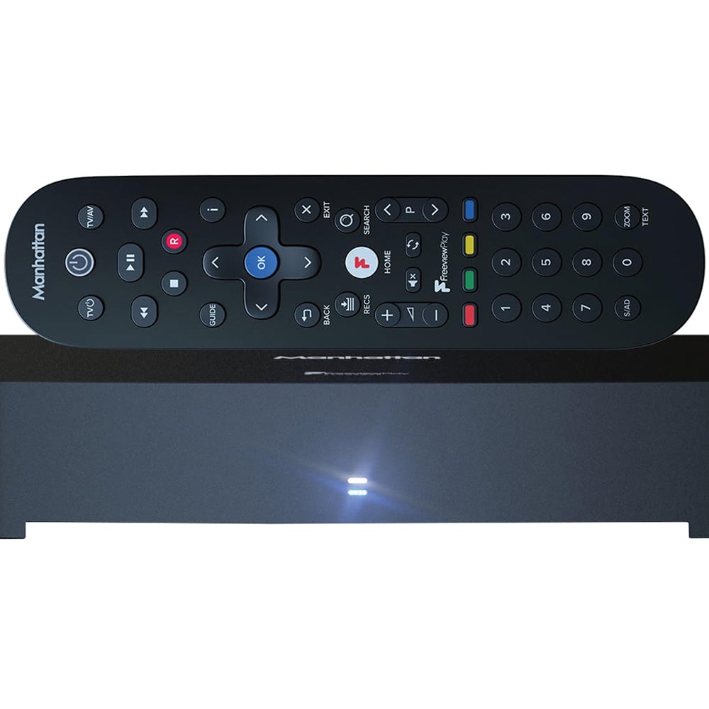 Discover the joy of live TV shows with the Manhattan Freeview Wi-Fi TV Recorder Box 1TB. This Freeview TV recorder box allows you to enjoy the best TV, live, recorded, and on-demand shows for free. It includes over 70 Freeview channels and 60,000 hours of on-demand content from leading apps like BBC iPlayer, ITVX and Channel 4. This Freeview recorder uses just an aerial to pause and rewind live TV, record two programmes at once or an entire series at the touch of a button. The TV recorder box features a 1TB hard drive that stores up to 600 hours of recordings smartly organised into categories and series. You can connect to Wi-Fi to unlock its Freeview Play features, catch up on missed shows, discover featured content, and search all channels, apps, and more. This product comes with a learning remote that can control your TV.