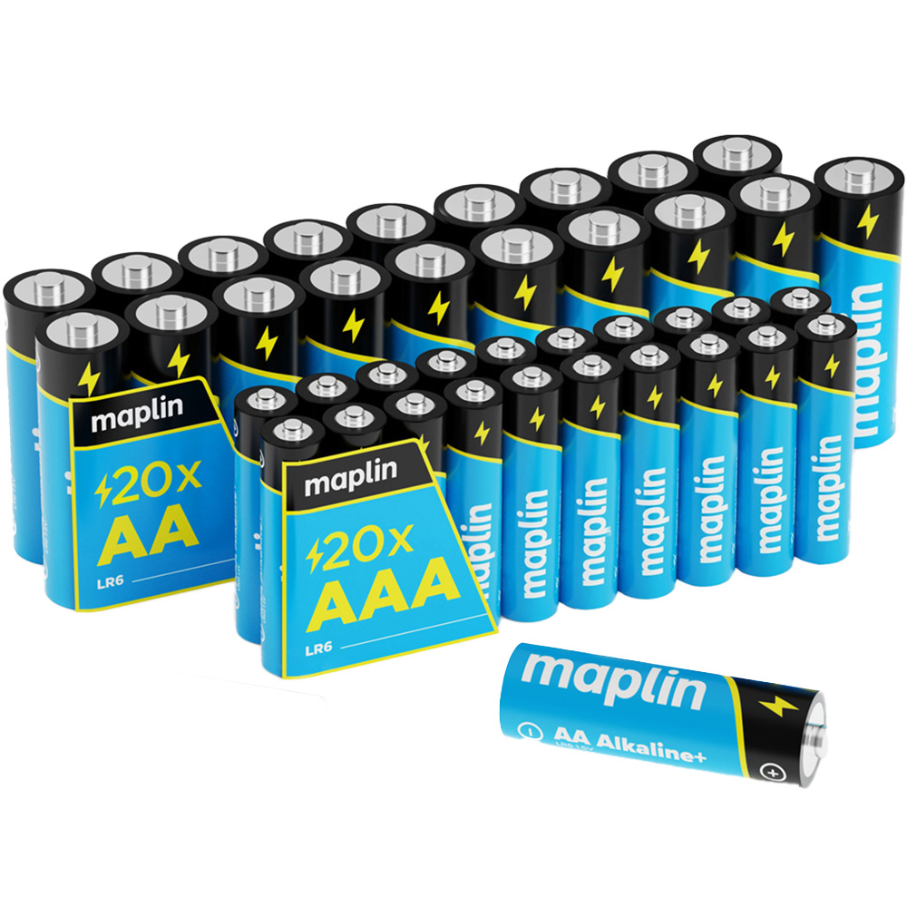 If you are short on power, then stock up with this pack of Maplin AA and AAA 1.5V Alkaline Batteries. With a high shelf life performance of up to seven years, they are great for a multitude of uses from TV remote controls to remote-controlled toys and also for cameras, MP3 players, torches, pocket TVs and games machines. In fact, they're ideal for pretty much any small, portable electronic and electrical device. These batteries have been specially designed for high drain and digital applications, and also offer superb leak-proof technology. They also offer excellent value, giving 20% more capacity than standard alkaline batteries. You can use these great batteries straight out of the pack. Pack size: 40 (20 x AA LR6 and 20 x AAA LR03 Batteries).