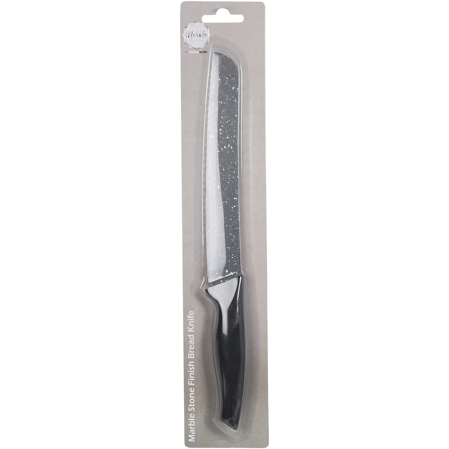 Cut bread more efficiently using the Marble Bread Knife in a stone-fleck finish. The blade uses high-quality Stainless Steel to ensure quality and offer lasting use. It has a serrated design perfect for cutting baguettes and more and a non-stick coating to prevent products from sticking. Finished with a soft grip and touch handle for easy use and comfort, it will make a fine addition to your kitchen.