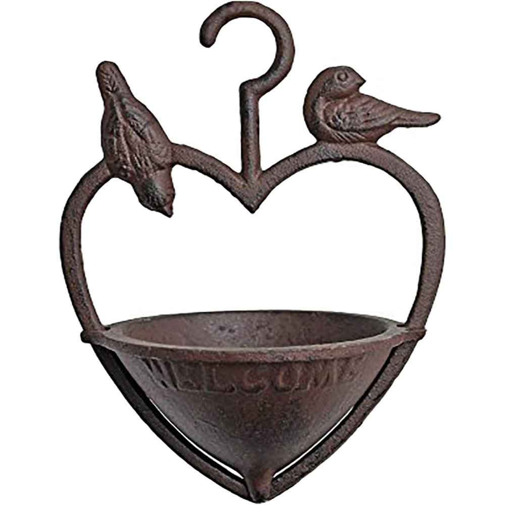 Welcome both your home & garden visitors with this Welcome Sign Bird Feeder. Mounted near your front door or hanging proudly in your back garden, it is sure to bring a vintage vibe to your outdoor space. Branded with a 'Welcome' sign on the front of the heart, this rustic hanging bird bath will not only let your winged friends have a feeding frenzy, but also a bath if you decide to fill this with water. Made from heavy-duty cast Iron, this bird feeder is weatherproof & waterproof and will last for many years to come. A perfect gift for a bird & garden lover! Dimensions - 22cm(H) x 16cm(W) approx.