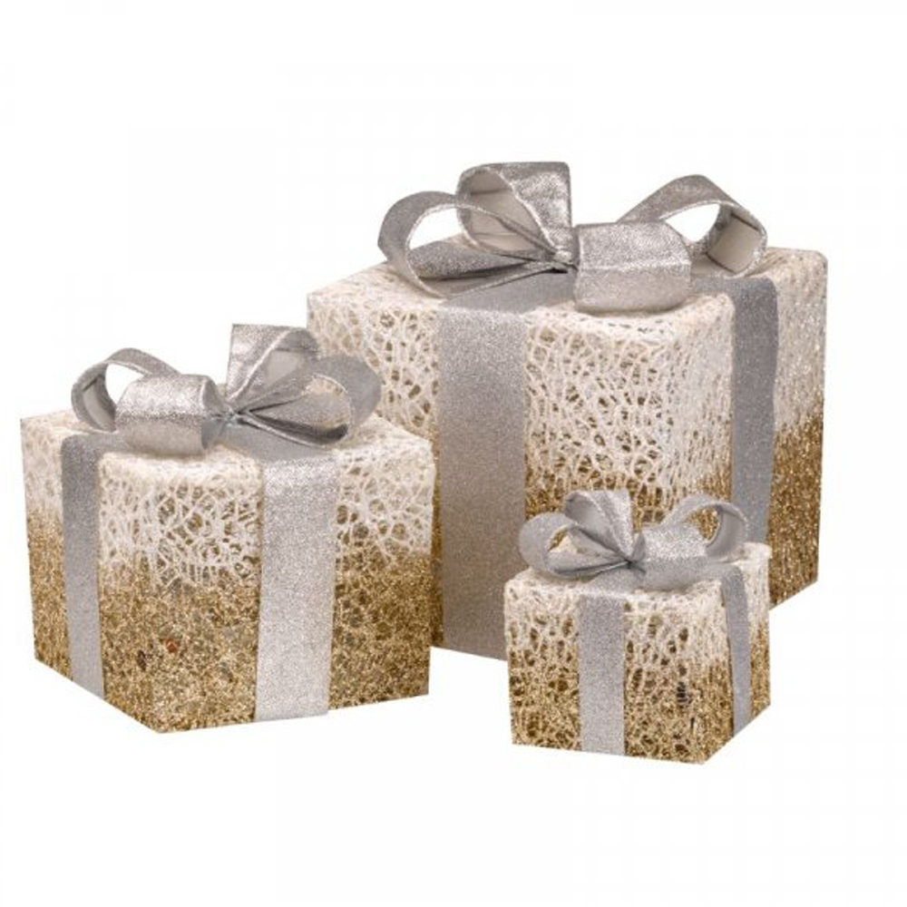 Unleash the splendour of your presents with the Marco Paul Gold Sparkly Faux Gift Box 3 Piece. These exceptional and classic festive ornaments bring warm white lighting when these silver sparkly boxes light up, adding an inviting glow to any space for several hours. These lights create a cosy environment with their eye-catching design, giving your holiday decorations an edge. These come in frosted style and complement any style of decor or decorating theme. You can improve your décor in just a few minutes by placing these boxes under the tree, at an entranceway to welcome guests, or in any corner of the home that could do with some festive cheer. Apart from these places, these can be also used in separate rooms, on window sills, mantles or as a table centrepiece when entertaining.