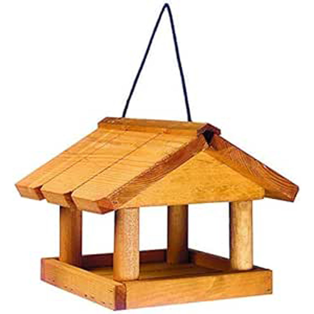 Lay out some seeds inside the little wooden bird hut and watch as the birds fly in and enjoy a meal. Grab yourself a cuppa and enjoy your garden as it comes to life. This wooden bird house comes with a string thread into the roof making it easy to hang from any branch or convenient location. The design of the birdhouse table means that it's most suitably used as a feeding table.