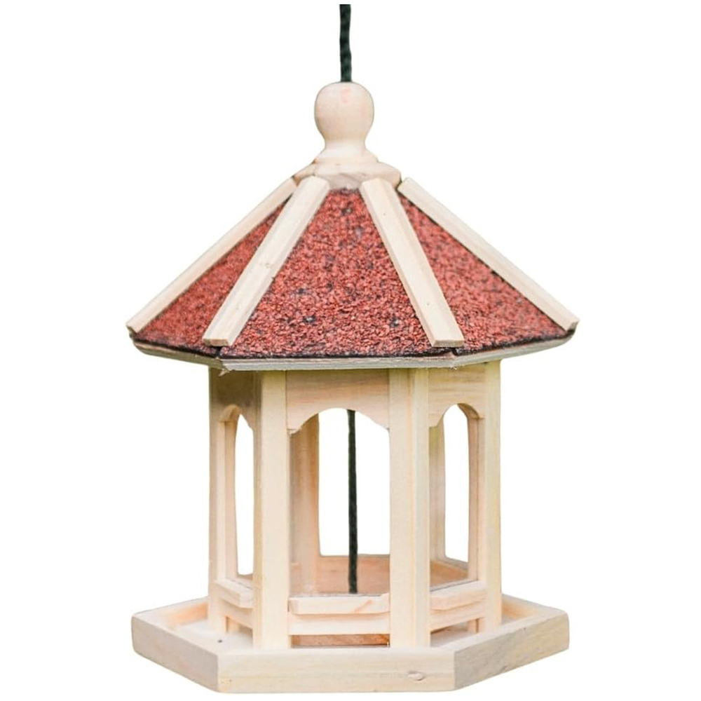 Feed your garden birds with this novelty bird feeder! A wooden Gazebo just for your wild birds Treat them to all different kinds of feed in this wooden feeding station. Easy to clean and refill - just use warm water. Hang from tree branches, brackets or have sitting on a table for them to reach - anywhere you see fit and where they will flock too. This feeder is weather and water resistant so can be kept outdoors for many years to come. A perfect addition for any bird lover!