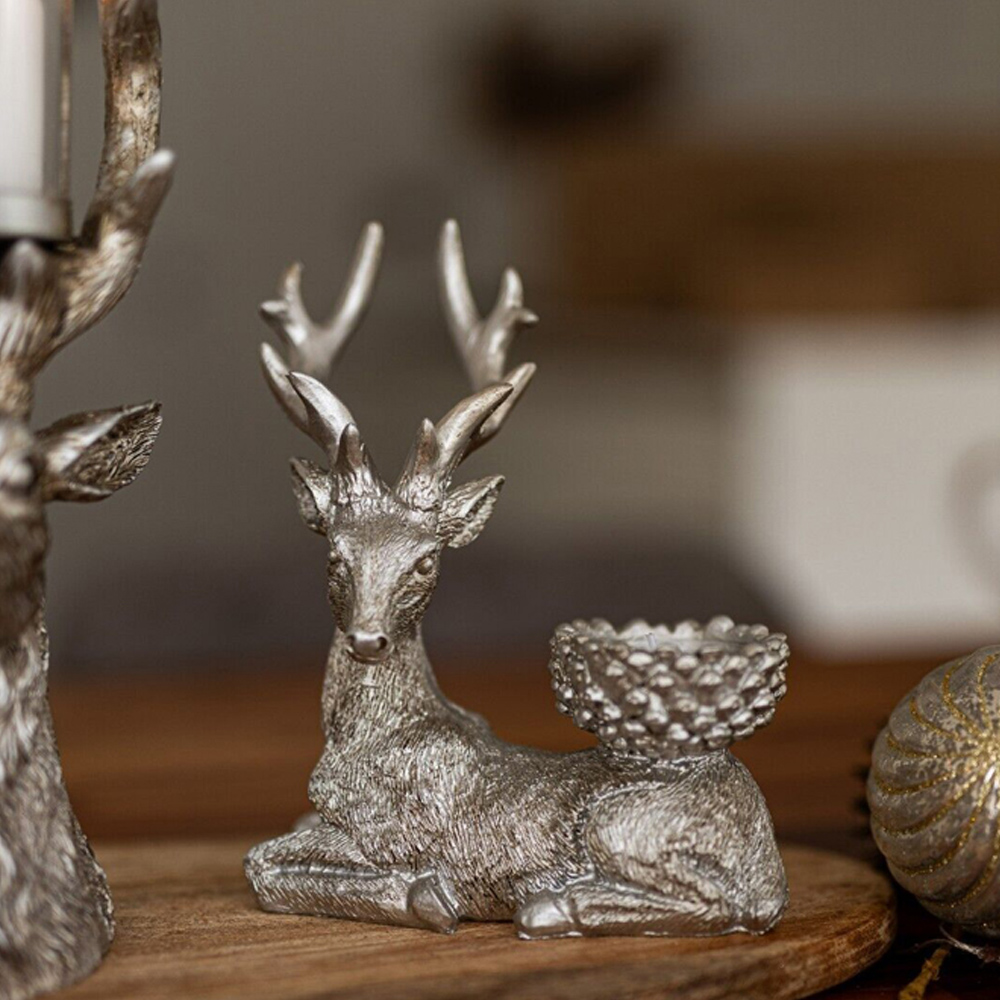 Elevate your home decor with these elegant silver Marco Paul 2 Pack Resin Deer Tealight Holder. With two stags lying down, each carrying a tealight on their back, these pieces bring a magical touch to your festive or year-round decor. A chic and versatile addition to any room.