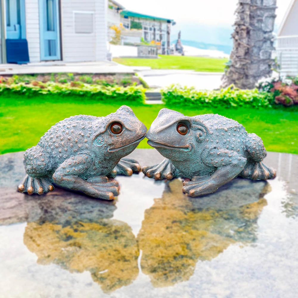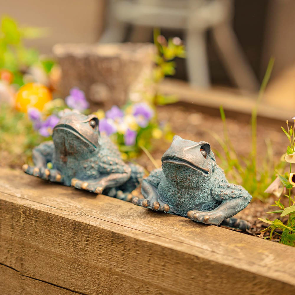 Bring your garden to life with these Frog Ornaments. Place this stunning animal on any patio, step, or lawn and enjoy this striking statue bringing some style and fun into your home or garden. Manufactured from hard wearing, waterproof and long lasting resin, this toad is finished with a weathered copper effect, these fun statues will fit in with any garden decor, modern or traditional. Smiling away, these little jumping frogs can be used indoors and outdoors wherever you see fit. A great addition to any outdoor space. 16cm x 10cm x 17cm approx. resin. free standing
