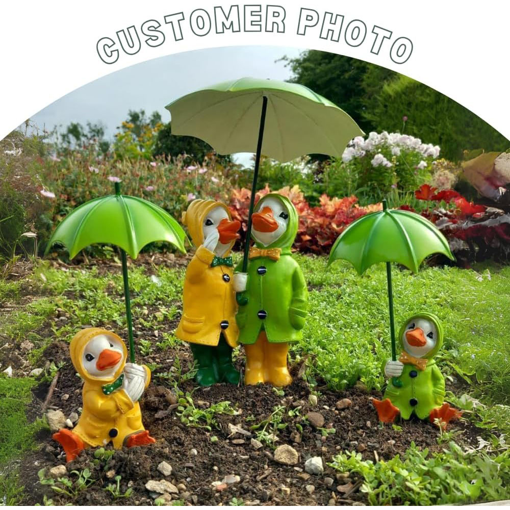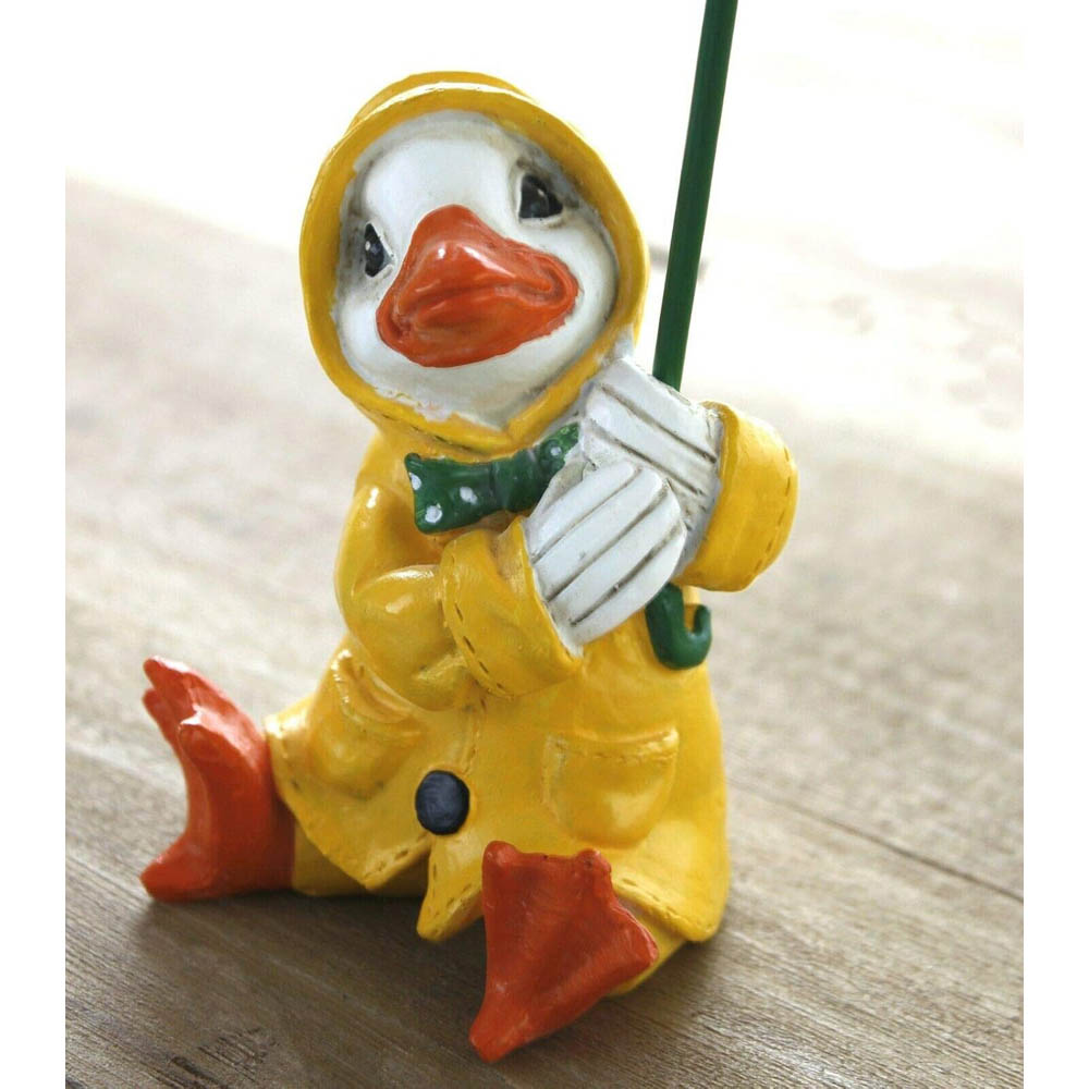 DUCK DECOR Charming and colourful come rain or shine!, our adorable ducks with raincoats and umbrellas are the ideal way to brighten up and bring fun to any area of your outdoor space! Choose from our standing duck couple, 2 sitting ducks or the whole family! OUTDOOR FRIENDLY Fully waterproof, these adorable ducks are moulded from durable resin and will comfortably stand up (or sit down) to the elements all year round! CHARMING DESIGNS In bright and bold colourways, these adorable ducks will catch the eye of any visitors and bring fun and colour to even the dullest area of your garden! Use them to welcome guests to your home or to bring character to a quiet corner! VERSATILE Perfect for any front door, porch or front garden. These adorable ducks are crafted with care from weatherproof resin so can stay outdoor all year if you wish! SPECFICATIONS Dimensions of Duck Couple 33cm(H) x 20cm(W) approx. Dimensions of Sitting Ducks 17.5cm(H) x 10cm(W) approx. Dimensions of Duck Couple: 33cm(H) x 20cm(W) approx. Dimensions of Sitting Ducks: 17.5cm(H) x 10cm(W) approx. Resin.