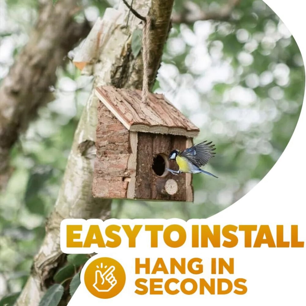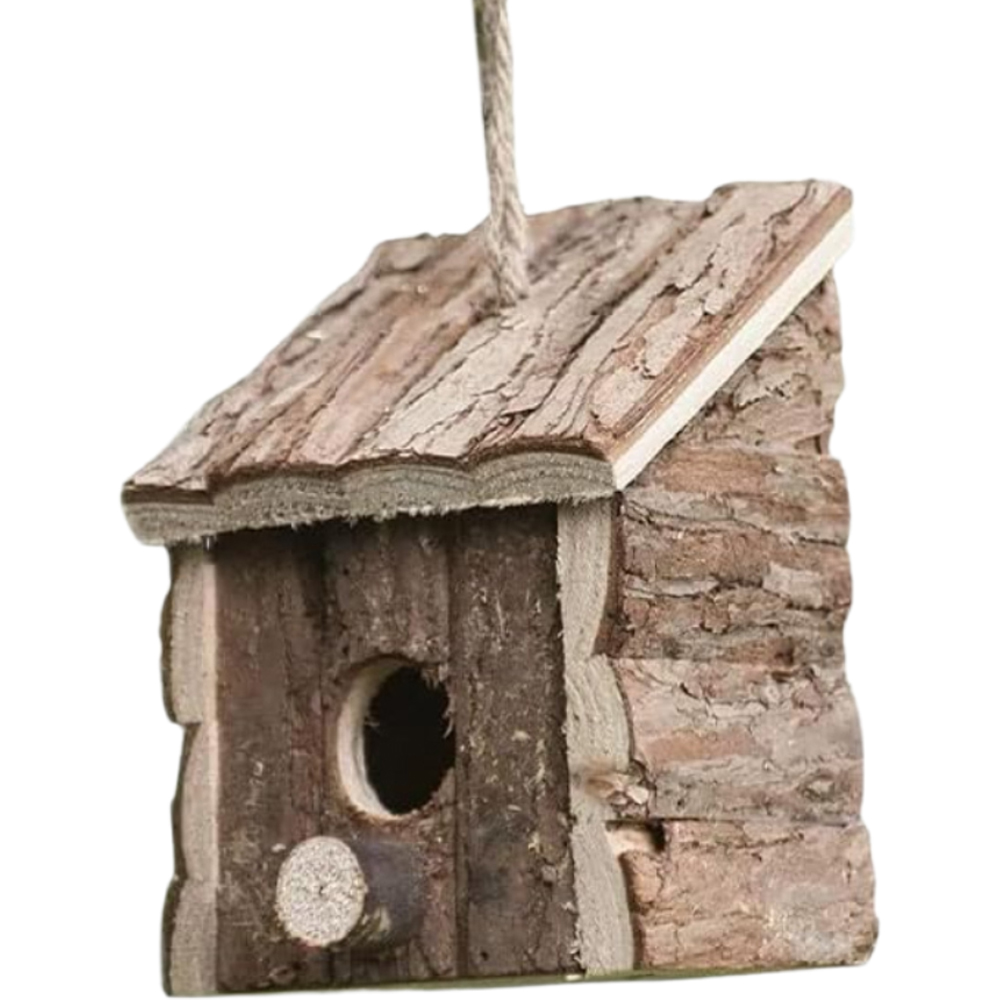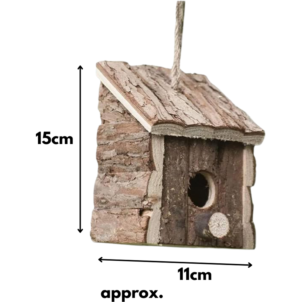 This adorable wooden bird house is crafted from strong, hard-wearing wood with a rustic look and sturdy hanging string. As well as looking great hanging anywhere around the garden, this bird house allows ample shelter for small birds visiting your garden. With a hole for small birds to enter the house with and an intricate log around the entrance, the house provides multiple little platforms for birds to perch on. Strong, sturdy and hard wearing, this house will stand up to the elements and provide shelter and nesting for wild birds all year round. Simply hang from any tree branch within the garden to allow shelter for any visiting feathered friends! Perfect gift for any bird or garden lover!