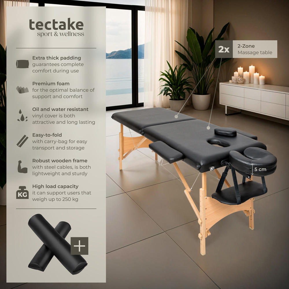 tectake Black 2 Zone Wooden Frame Foldable Massage Table with Bolsters and Carry Bag
