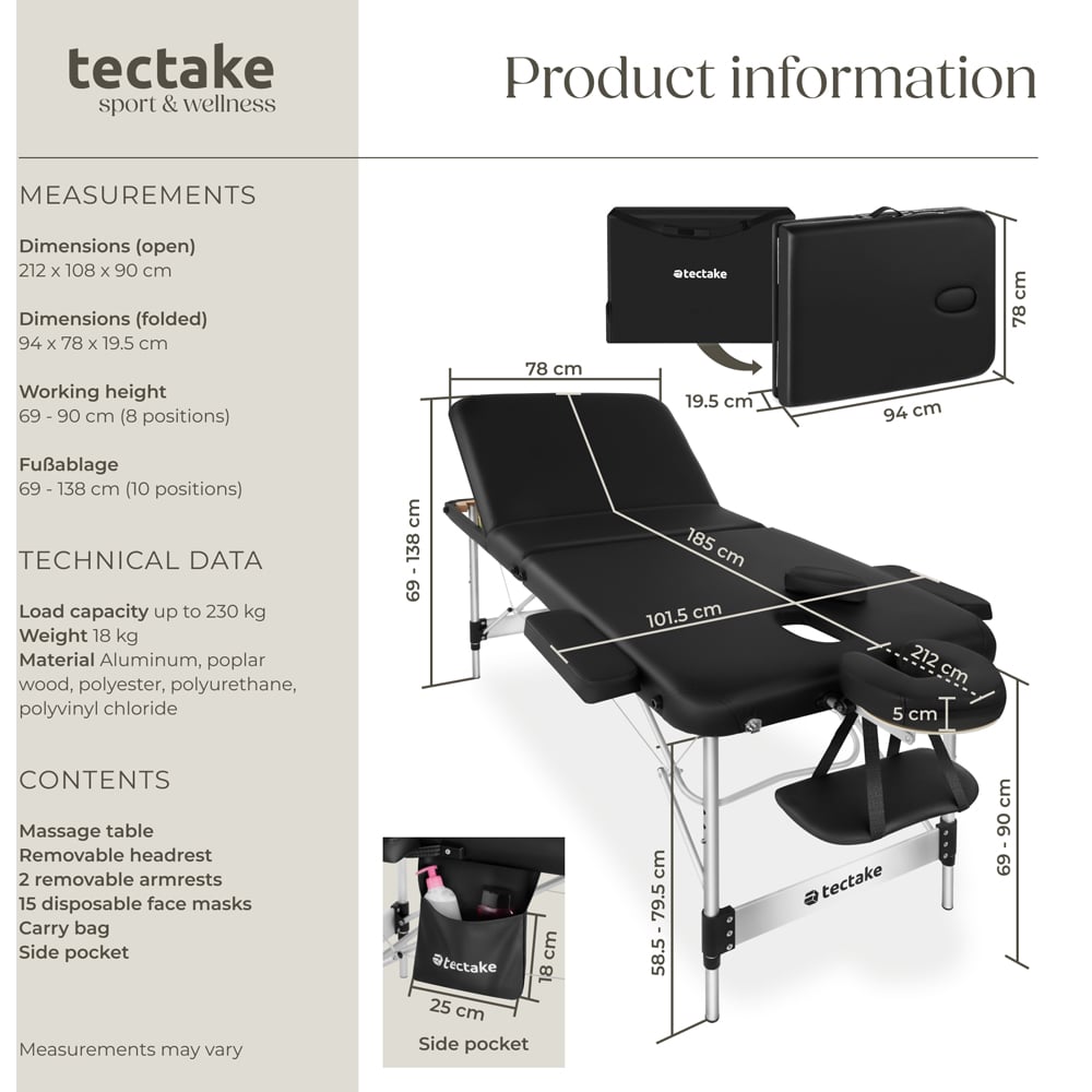 Treat yourself to pure relaxation with the foldable 3-zone massage table Ko Tao from tectake. Thanks to high-quality materials and thoughtful features, every massage becomes a special experience. The padding made of 5 cm thick fine cell foam guarantees a soft lying feeling. The robust aluminium frame combines stability with mobility, while the height-adjustable construction and adjustable footrest ensure ergonomic adaptation. Plus, with the 15 supplied disposable face cradle covers, the headrest remains hygienically clean perfect for a worry-free massage and reduced cleaning effort. Additionally, a practical side pocket ensures that accessories such as oils or cloths are always within reach. The removable headrest, the removable face cushion and the removable armrests make cleaning easier and at the same time offer comfort and flexibility thanks to their adaptability. After use, the entire construction can be folded up to save space and stored in the carrying bag ideal for mobile use or storage. A high-quality massage table is essential for any professional spa or beauty treatment setting. Whether you're offering a relaxing massage or a couch treatment, having the right portable tables can make all the difference. Complement your setup with essential accessories like stools, chairs, and adjustable beds for maximum comfort and convenience. Ideal for both personal and commercial use, a well-designed massage table ensures an optimal experience for both the client and the therapist. The 3-zone massage table Ko Tao from tectake combines comfort, hygiene and mobility in a thoughtful design. From the soft padding to the hygienic disposable covers with this table you transform any place into your personal wellness oasis.