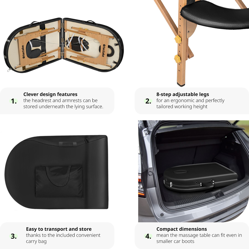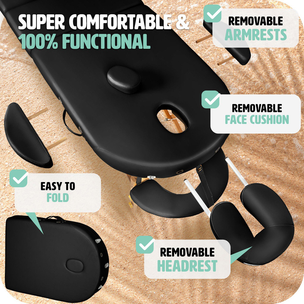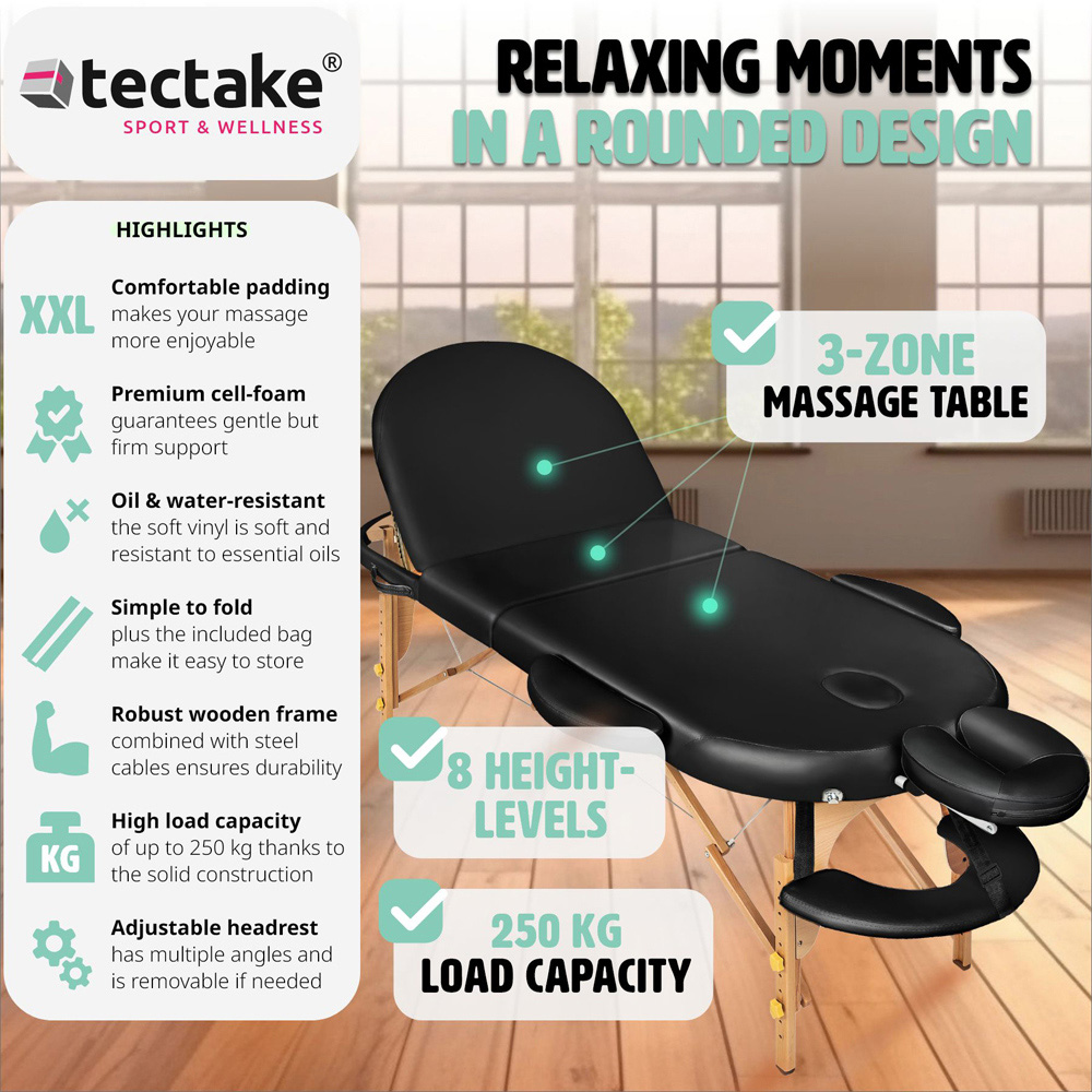 This cleverly designed massage table from tectake offers unsurpassed stability, safety and lying comfort of the highest quality (padding height 10cm, pure upholstery approx. 5cm) and is also lightweight and portable thanks to the practical carry bag (included in the price)! The folding table is also height adjustable meaning optimal massage positions can be obtained. The comfortable cushioning of the couch is made of high-quality, fine-cell foam (Oxford 600D very strong) that perfectly moulds to the shape of the body so that the weight is evenly distributed and pressure points are avoided. The table's soft, vinyl cover is scratch- and impact-resistant as well as water- and oil-repellent.