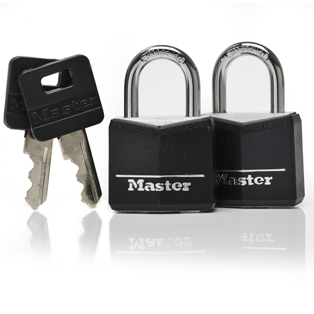 Protect your belongings with the Master Lock 30mm Vinyl Covered Aluminium Padlock 2 Pack. With its scratch and corrosion-resistant black vinyl-covered aluminium body and hardened steel shackle, this padlock is perfect for both indoor and outdoor use. Its 4-pin cylinder and dual locking lever mechanism provide pick and pry resistance, ensuring maximum security. Plus, with a 30mm wide lock body and a 5mm diameter shackle that is 18mm long, it's versatile enough to be used as a locker lock, cabinet lock, or tool chests and boxes. You'll get two padlocks, two keys, and a limited lifetime warranty against mechanical failure.