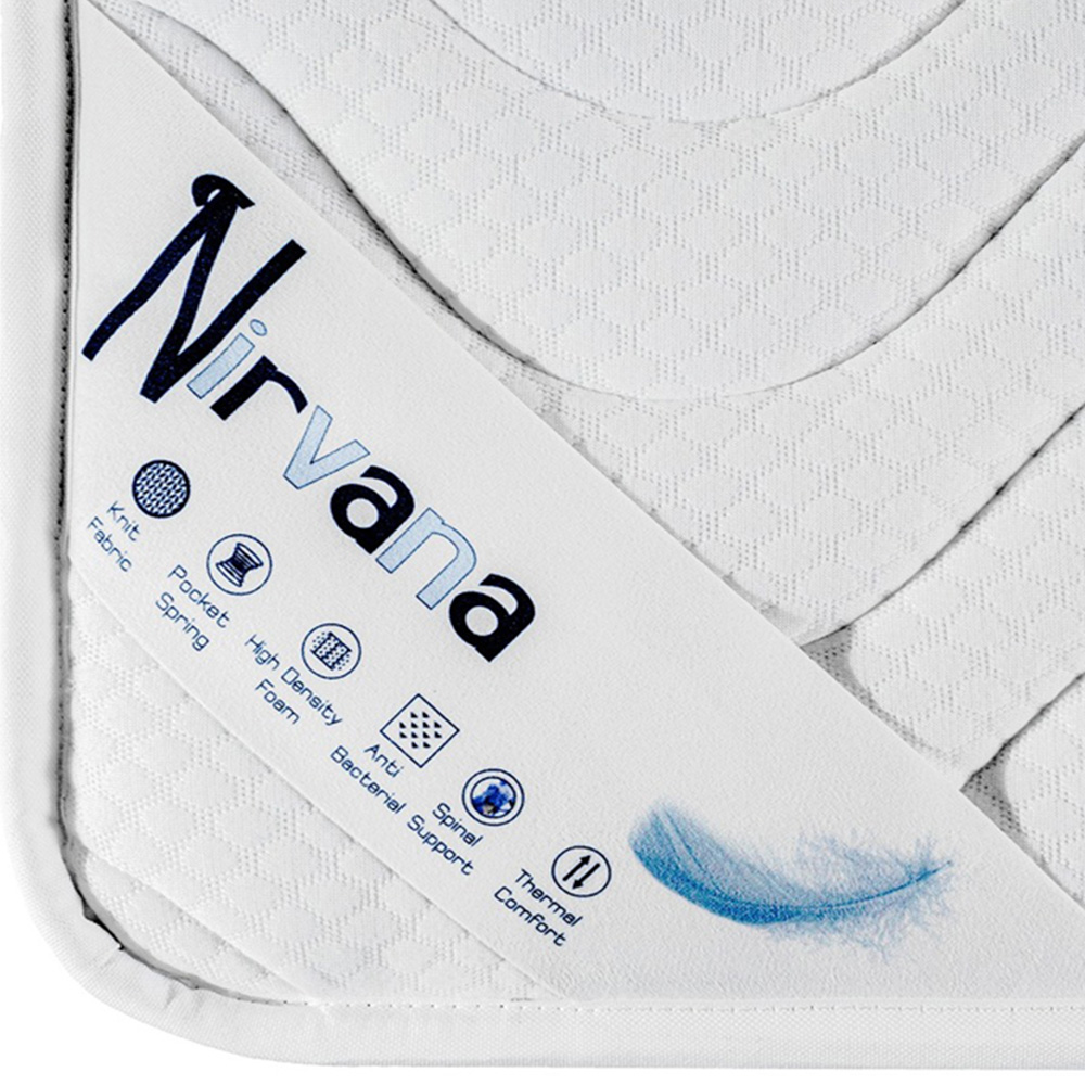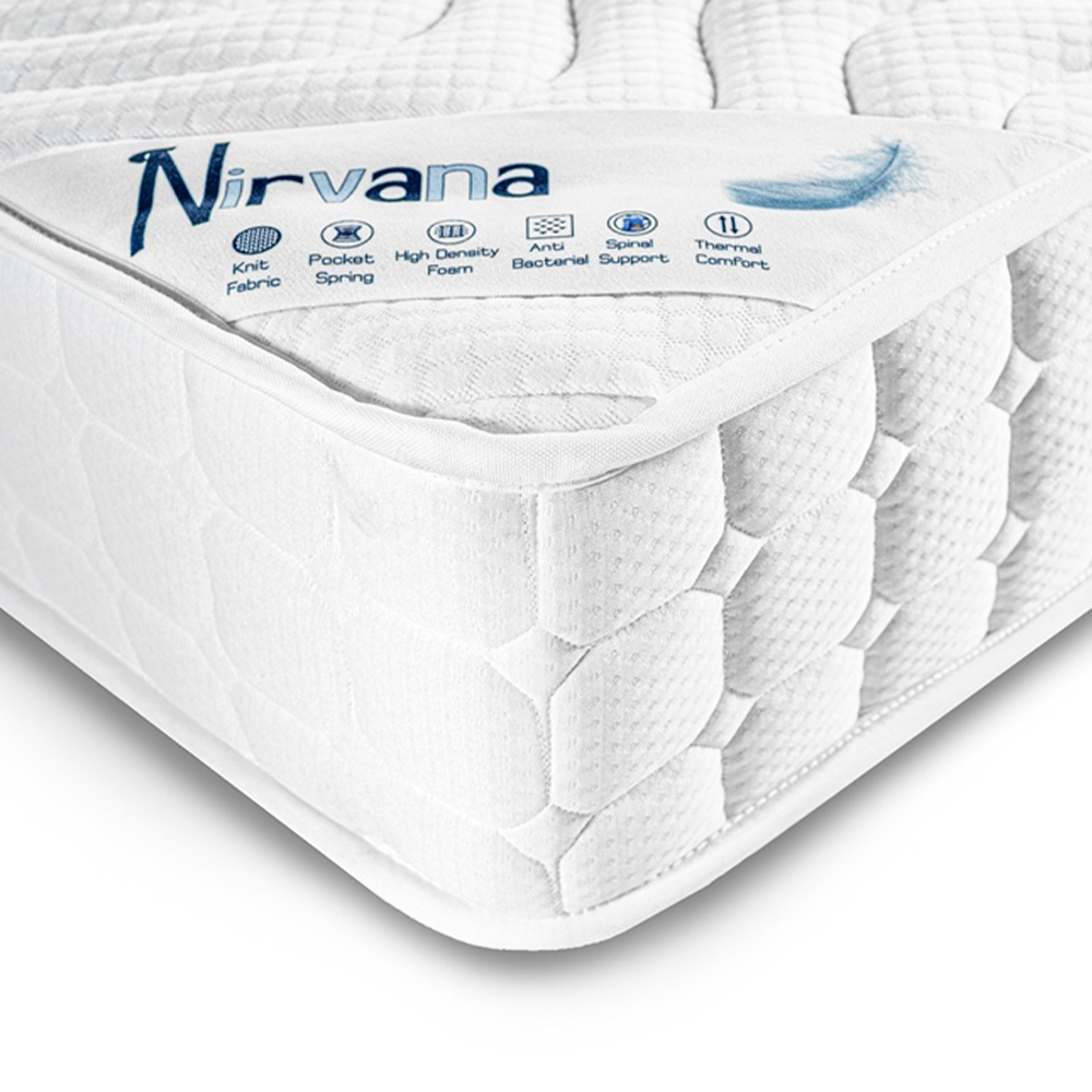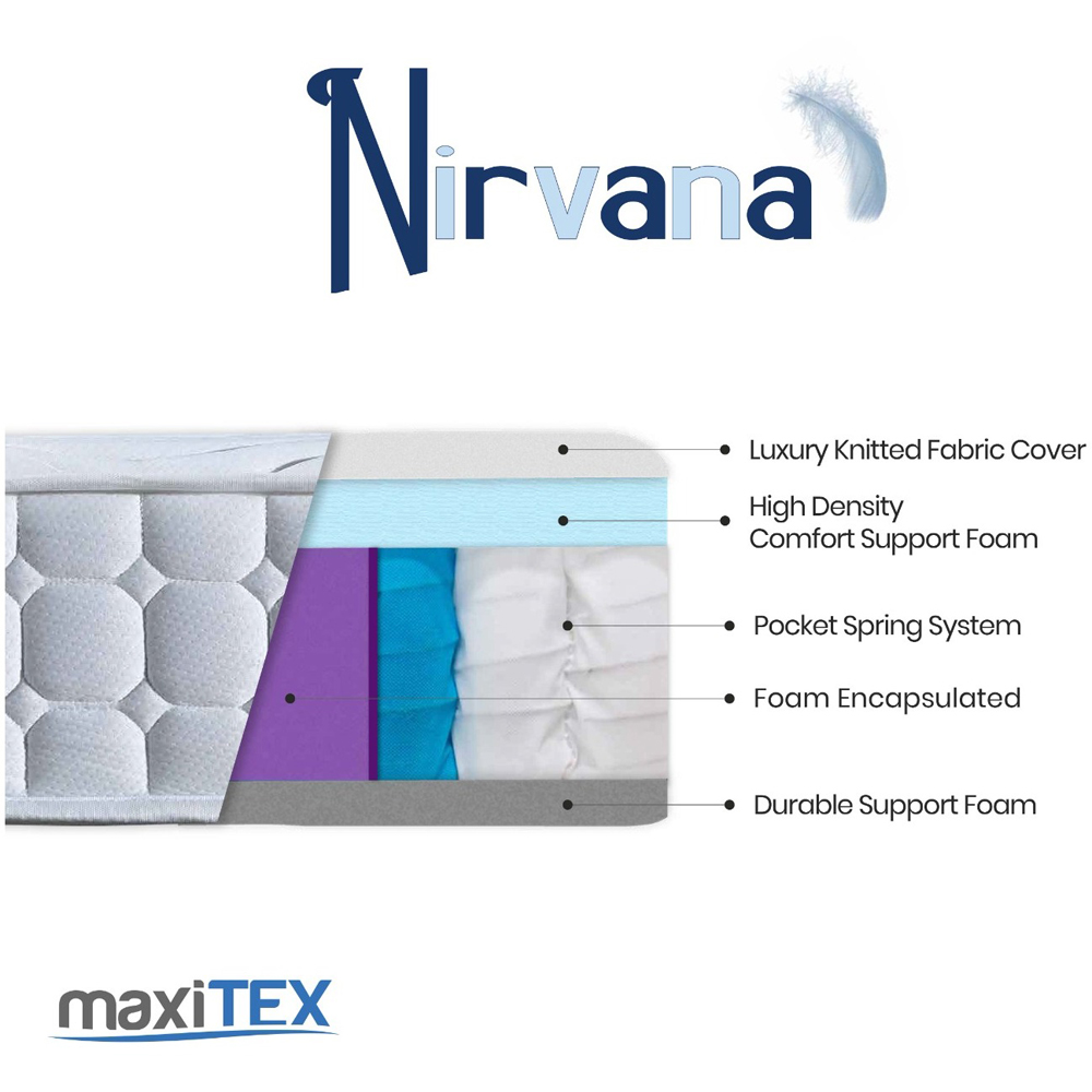 Experience the blissful comfort of the Maxitex Nirvana Pocket Sprung Mattress. Designed with your ultimate relaxation in mind, this mattress features a pocket-sprung system that offers exceptional support and minimizes motion transfer. With anti-bacterial properties, it ensures a clean and hygienic sleep environment. The spinal support and thermal comfort technologies ensure that your body is properly aligned and temperature-regulated throughout the night. The high-density foam and 2cm plate foam provide additional cushioning and support, while the knit fabric adds a touch of elegance. At 23cm thick, this mattress offers a substantial sleeping surface. Conveniently roll-packed and vacuum-sealed, it's easy to transport and set up.