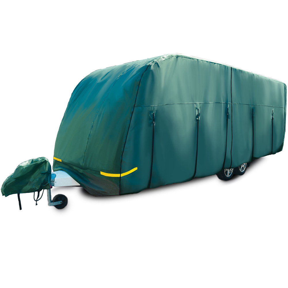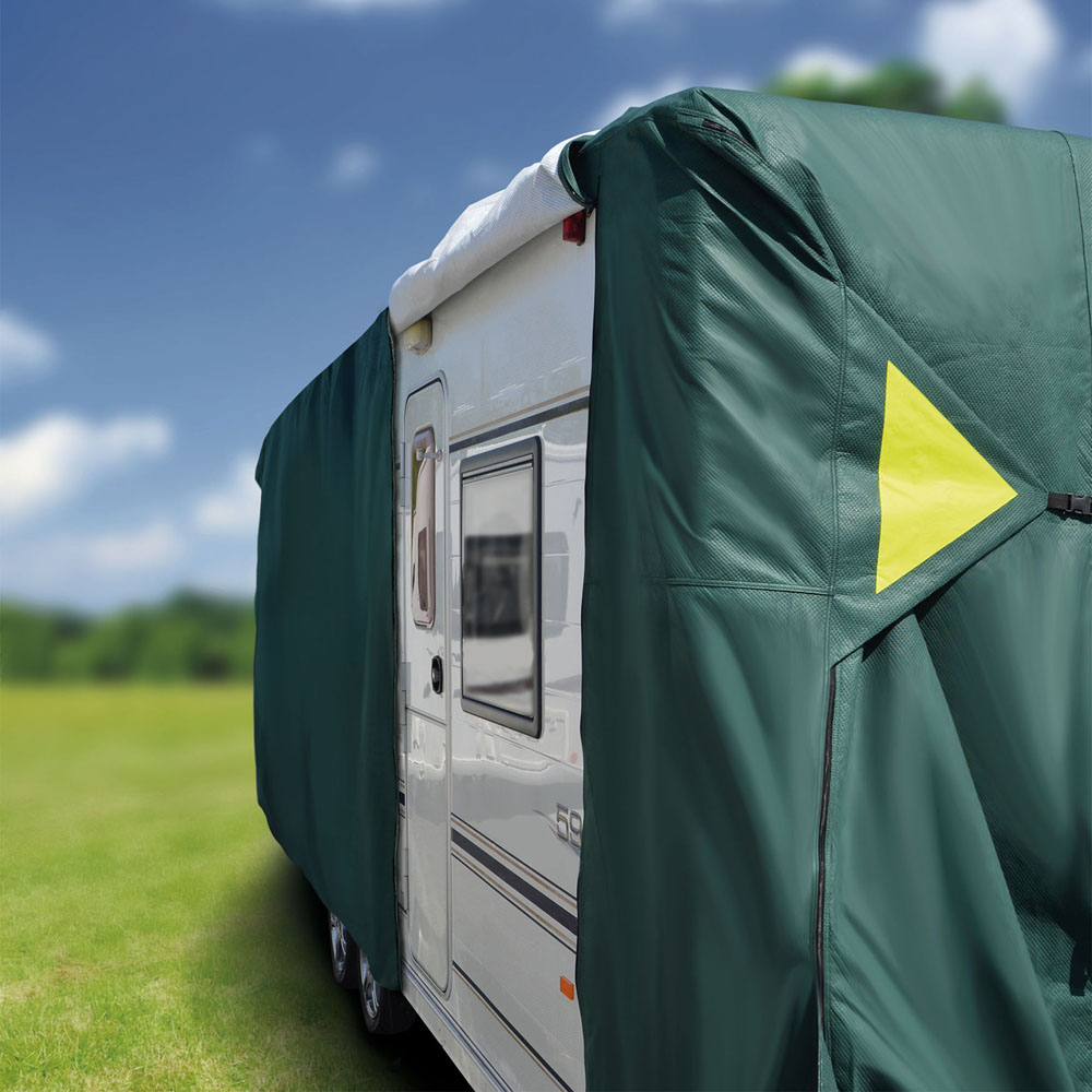 Protect caravans from the elements and keep them looking their best with a premium green four-ply cover designed to fit models between four point one and five metres. Three convenient zip locations on the nearside make door access and fitting a breeze, while four double-stitched adjustable nylon straps and covered vents ensure secure placement and breathability. A matching breathable hitch cover with an adjustable strap completes the set, giving peace of mind for every journey or storage period.