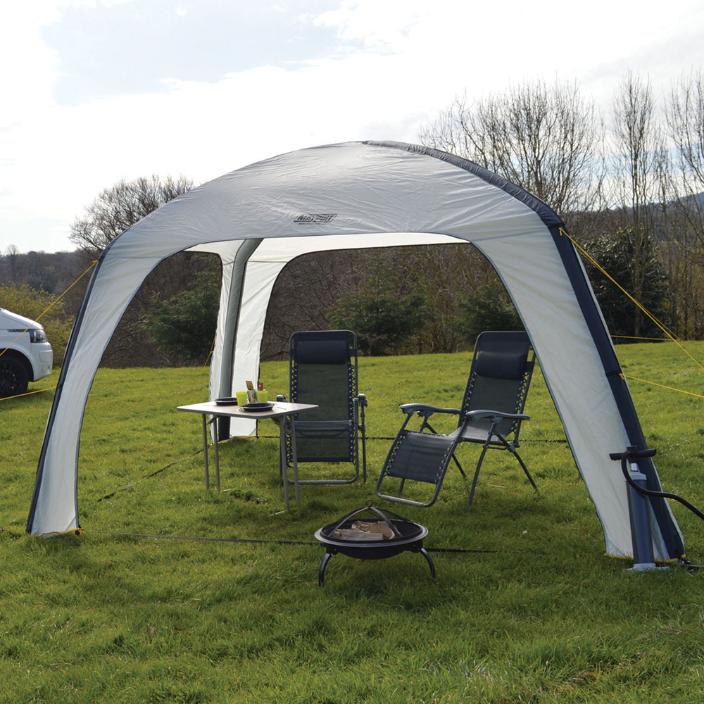 Perfect for the campsite, park or garden, this inflatable event shelter does it all! Easy to pitch, pumping up the sturdy air beam with the hand pump provided. The tensioning straps on all four sides ensure a square shape. There is a single inflation point, making it quick and easy to pitch and can be done by one person. Plus, it includes highly visible guys, pegs, and a carry bag for added convenience.