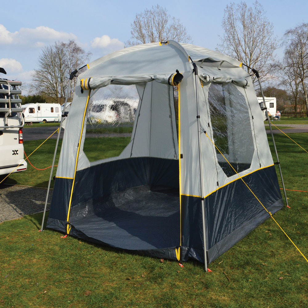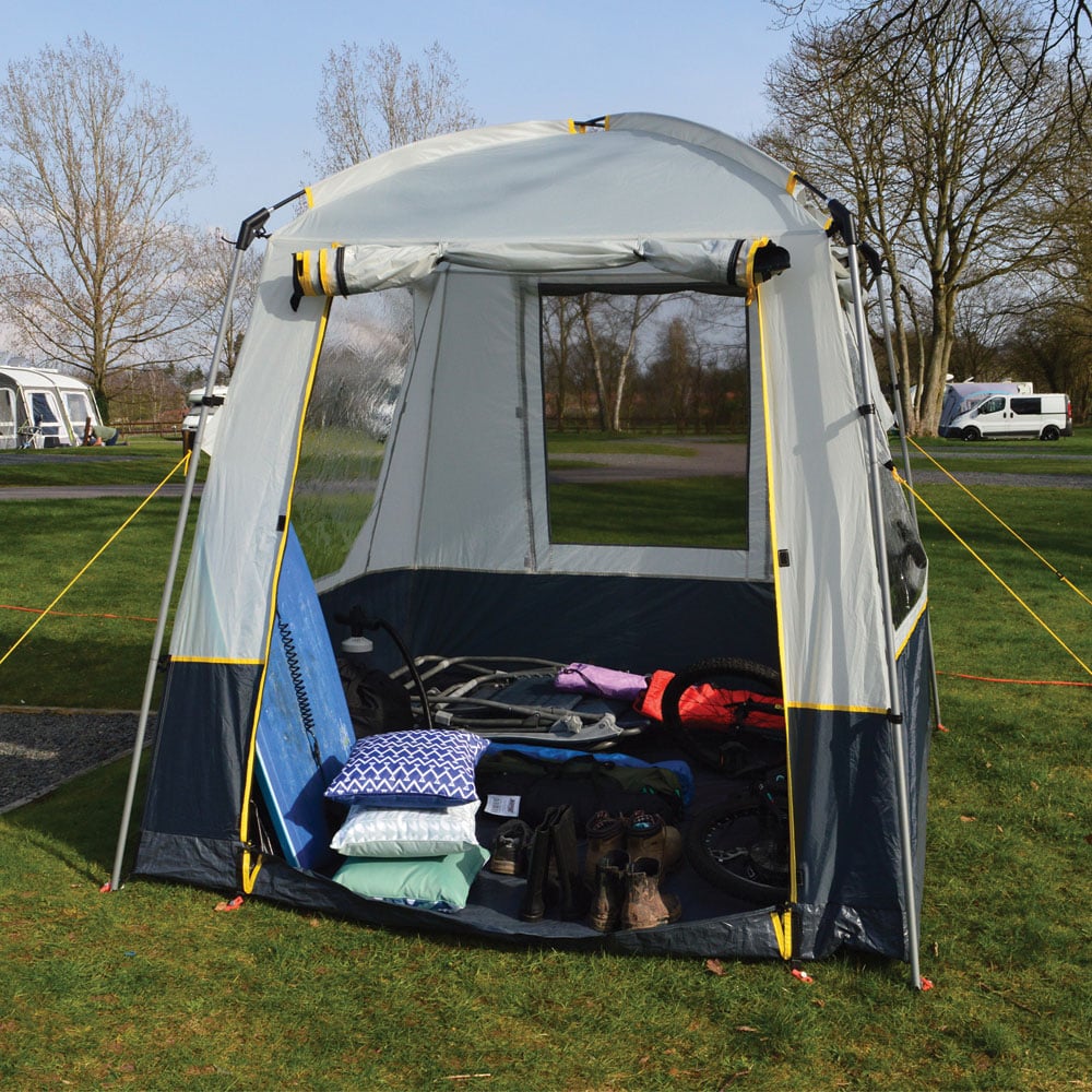 This utility storage tent is ideal for longer holidays when extra on-site storage is needed. The tent is very easy to put up and has a sewn-in groundsheet so the contents can be protected from the wet grass and the elements. The tent has three crystal clear PVC windows with privacy covers. Made using 3000mm Hydrostatic fabric, it has two side roof vents to help ventilation, as well as a large roll-up front door with toggles and a large mesh panel at the back of the tent. Plus, it comes complete with steel poles, highly visible guys, pegs, and a carry bag for added convenience.