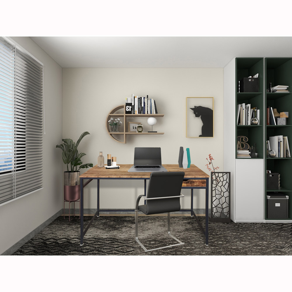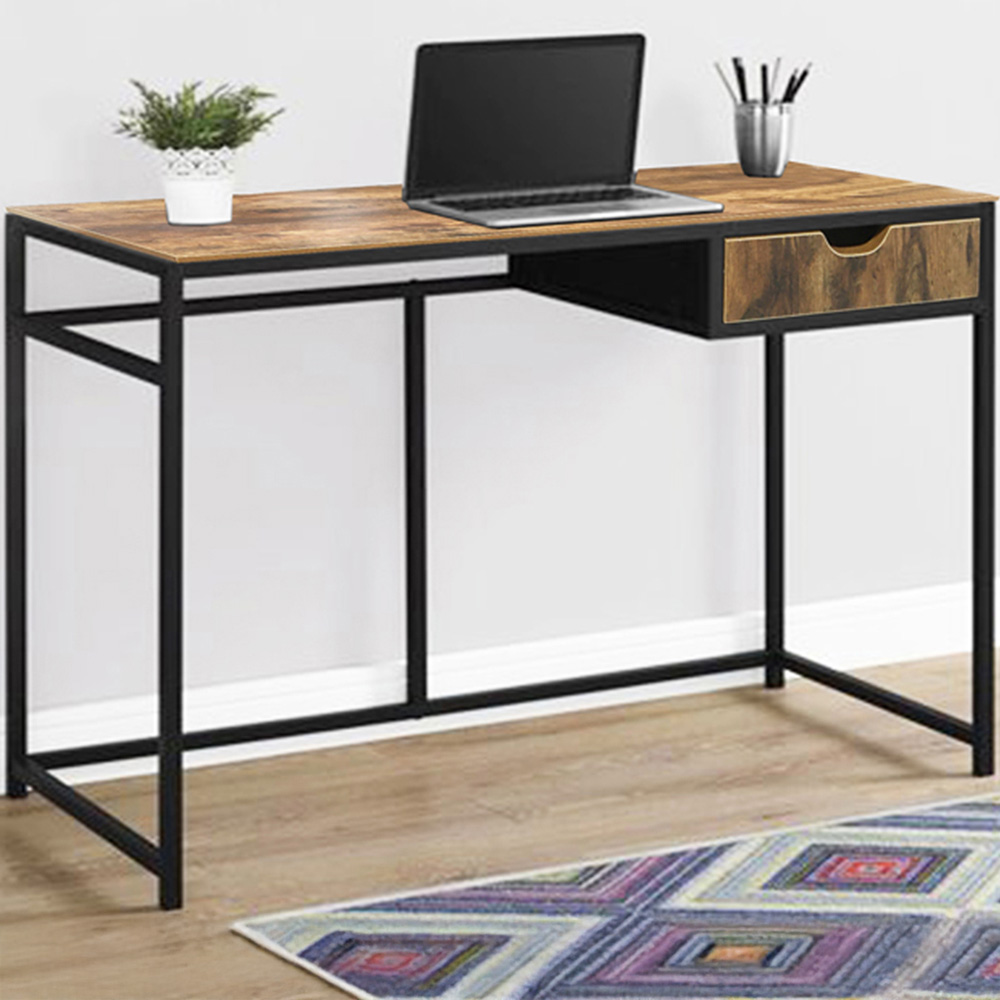 This handsome writing desk combines chic, modern lines with a touch of rustic appeal. Its charming finish of antique nutmeg pleasingly offsets the contemporary edge of its satin black steel frame. With a neutral colour scheme and simple design, this desk can match a variety of decor styles. Its simple wooden surface is perfectly sized to hold laptops, notebooks, and more. Sleek and compact, this desk is perfectly sized to fit into small spaces. A single drawer opens on extension glides for easy access to your supplies, papers, and electronics.