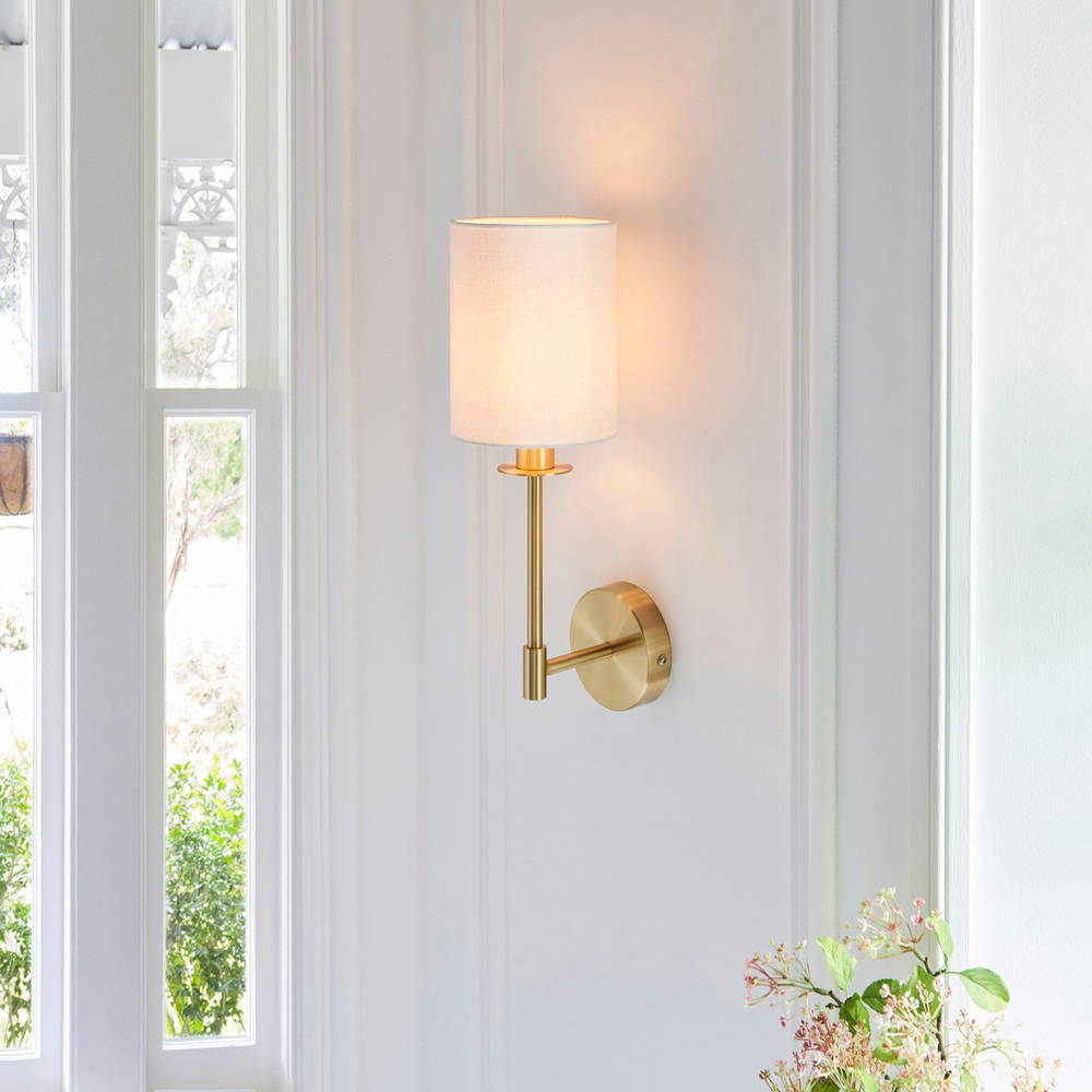 Brighten your living space with the Merano Pistoia Satin Brass and White Wall Lamp. It features a versatile design perfect for any space and flaunts a charming brass hue. This wall lamp is designed with a vintage white fabric shade to diffuse the light and illuminate the dim hallway or entryway instantly. With a gleaming finish, this lamp effortlessly adds a touch of sophistication to your space. Please click here to find our range of lightbulbs.