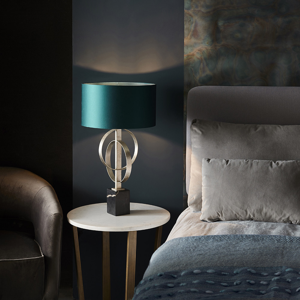Elevate your space with the Merano Trento Antique Silver and Teal Table Lamp. Its luxurious fabric shade and antique finish create a warm, elegant glow, perfect for enhancing the ambience in bedrooms or living areas with timeless sophistication. This design complements a variety of interior styles.