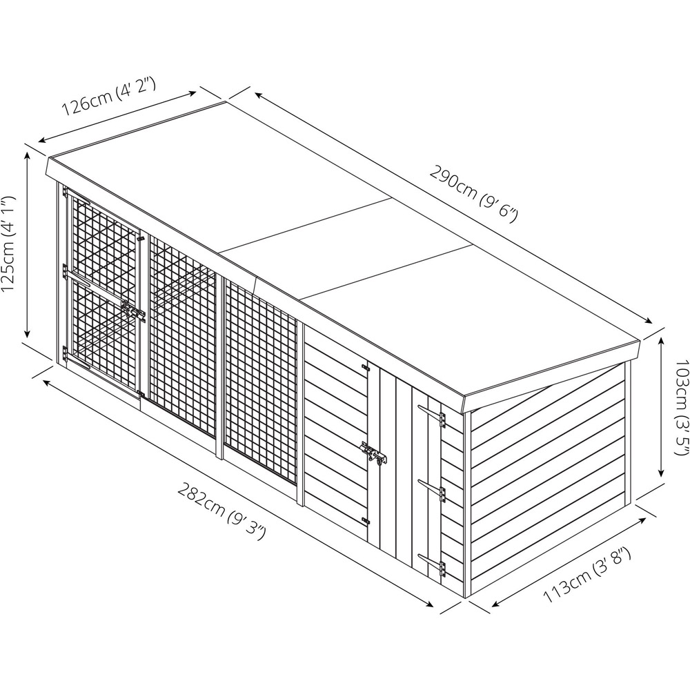Provide your pet with the comfortable and cosy shelter they dream of with Mercia Berkshire Dog Kennel and Run 10 x 4. The mesh used in the front panel prevents any potential escape bids while allowing plenty of light and fresh air to enter the interior. The walls, floor and roof are made using interlocking 12mm tongue and groove cladding. Two doors feature in this dog kennel, one that enters the sheltered area and one that enters the open-faced section. Extremely robust and designed to comfortably withstand the harshest of weather conditions - this garden dog run is supported by 28mm x 28mm. The floor tiles that feature in the kennel are completely removable, which makes it very easy to clean. It comes complete with a ten-year anti-rot guarantee.