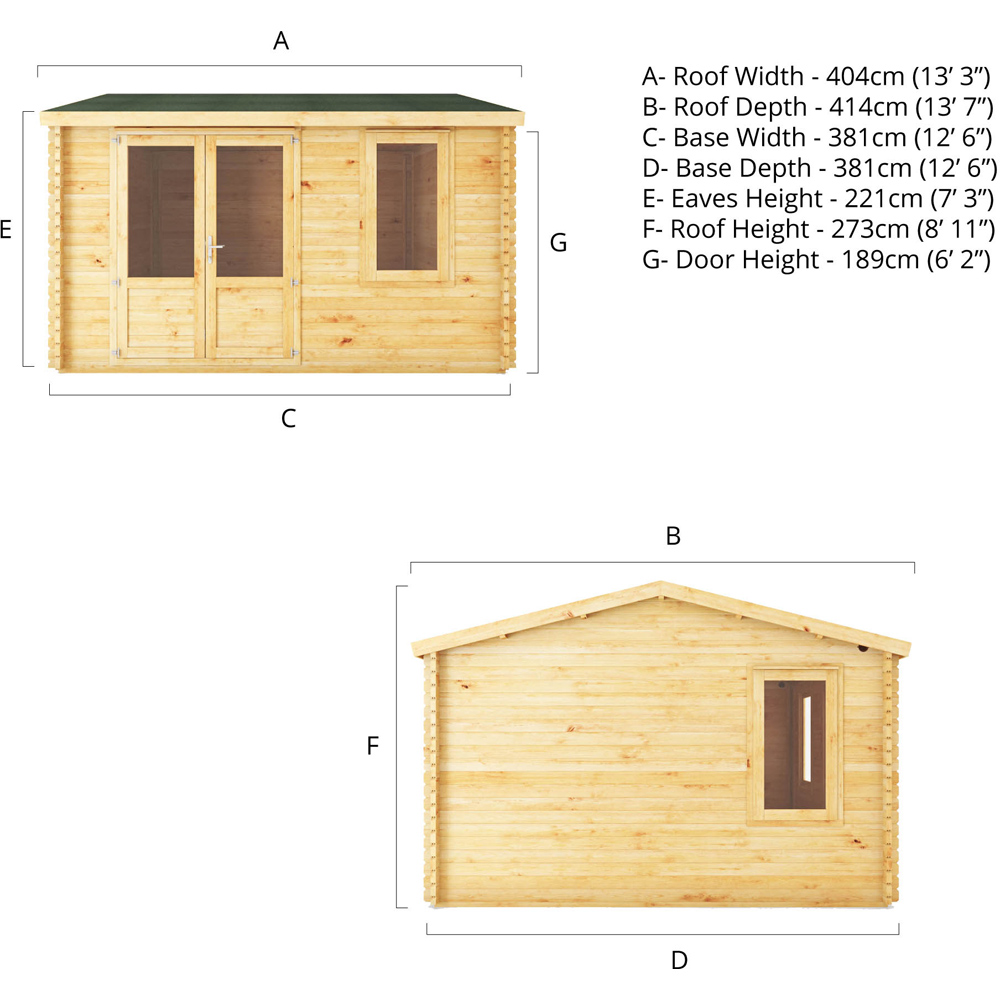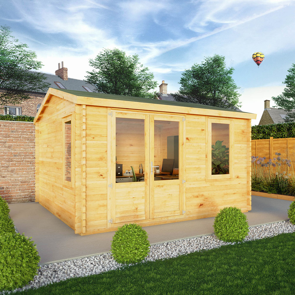 Transform your outdoor space with the Mercia 13.1 x 13.1ft Home Office Log Cabin. This cabin offers ample space for all your outdoor needs. Highlighted by its Alpine-inspired apex roof and delightful opening windows, effortlessly blends with any outdoor setting. The traditional apex roof design creates an airy interior, allowing it to accommodate taller furnishings and decor. The expansive windows and double doors allow natural light into the interior, creating a bright atmosphere. Features: Constructed from sturdy tongue and groove boards, the log cabin features robust panels that ensure durability and stability. The interlocking panels provide additional strength, while premium roofing safeguards the cabin from all weather. Enhanced ventilation is provided by an additional vent, reducing the risk of moisture buildup. The contemporary yet timeless ironmongery adds a stylish finishing touch. The 10-year anti-rot guarantee offers peace of mind. To maintain the guarantee, annual wood treatment is required to prevent fungal attacks. Supplied with a secure mortise lock and key, you can be confident in the security of your new building. You can opt for a Home Installation Service, where our expert installers will construct your cabin. In case the construction is to be done yourself, the cabin will be delivered as individual tongue and groove timber lengths, ready to be assembled on a firm and level base.