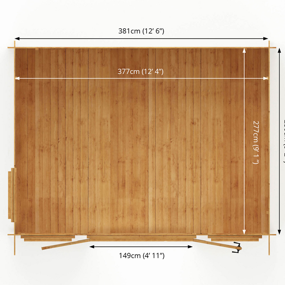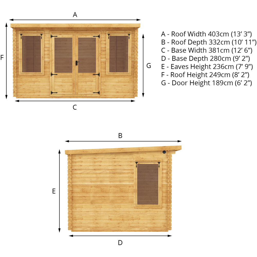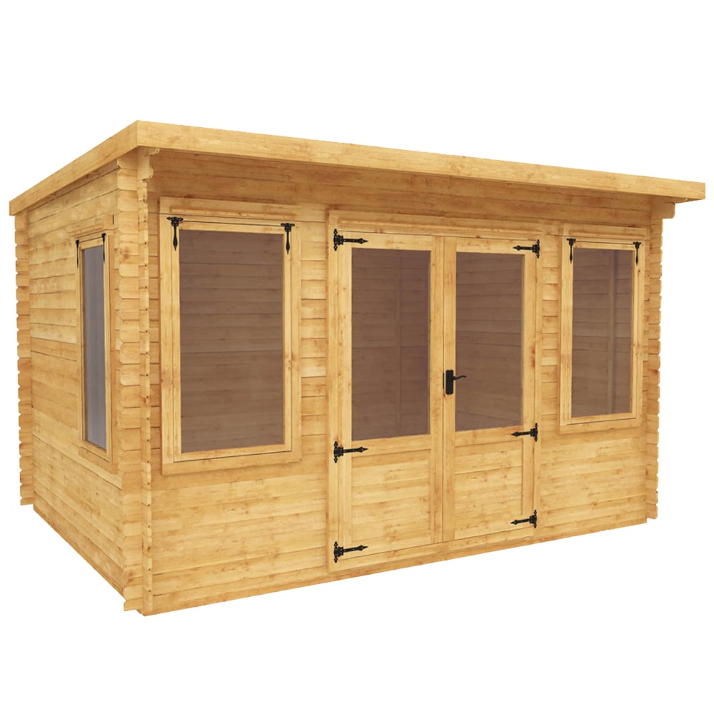 The 4 x 3m Pent Log Cabin from Mercia is a contemporary and spacious garden building, ideal for those looking for somewhere to enjoy hobbies, entertain guests or simply as a place to relax within the garden. Featuring three large opening windows and half glazed double doors, the interior is bright, airy and welcoming. The glaze on the windows and doors with high strength SAN styrene, a safe and shatterproof alternative to glass. This modern log cabin is constructed using high quality, 19mm, Baltic pine log boards that interlock each other to form rigid and strong panels. The interlocking system creates a weatherproof and heat retaining structure, meaning you can use this log cabin all year around! The roof and floor are constructed with hard wearing tongue and groove boards to form a robust and long lasting finish. High quality roofing felt is provided to cover the roof, to protect the building from the elements. It is supplied antique style handles and hinges as well as lock and key for the door, to keep your building secure when not in use. This log cabin is manufactured here in the UK, using sustainably sourced and regulated timber. The cabin is supplied un-treated and will require a coat of high quality timber treatment once installed. The log cabin will be delivered as individual tongue and groove timber lengths and should be constructed on a firm and level base.