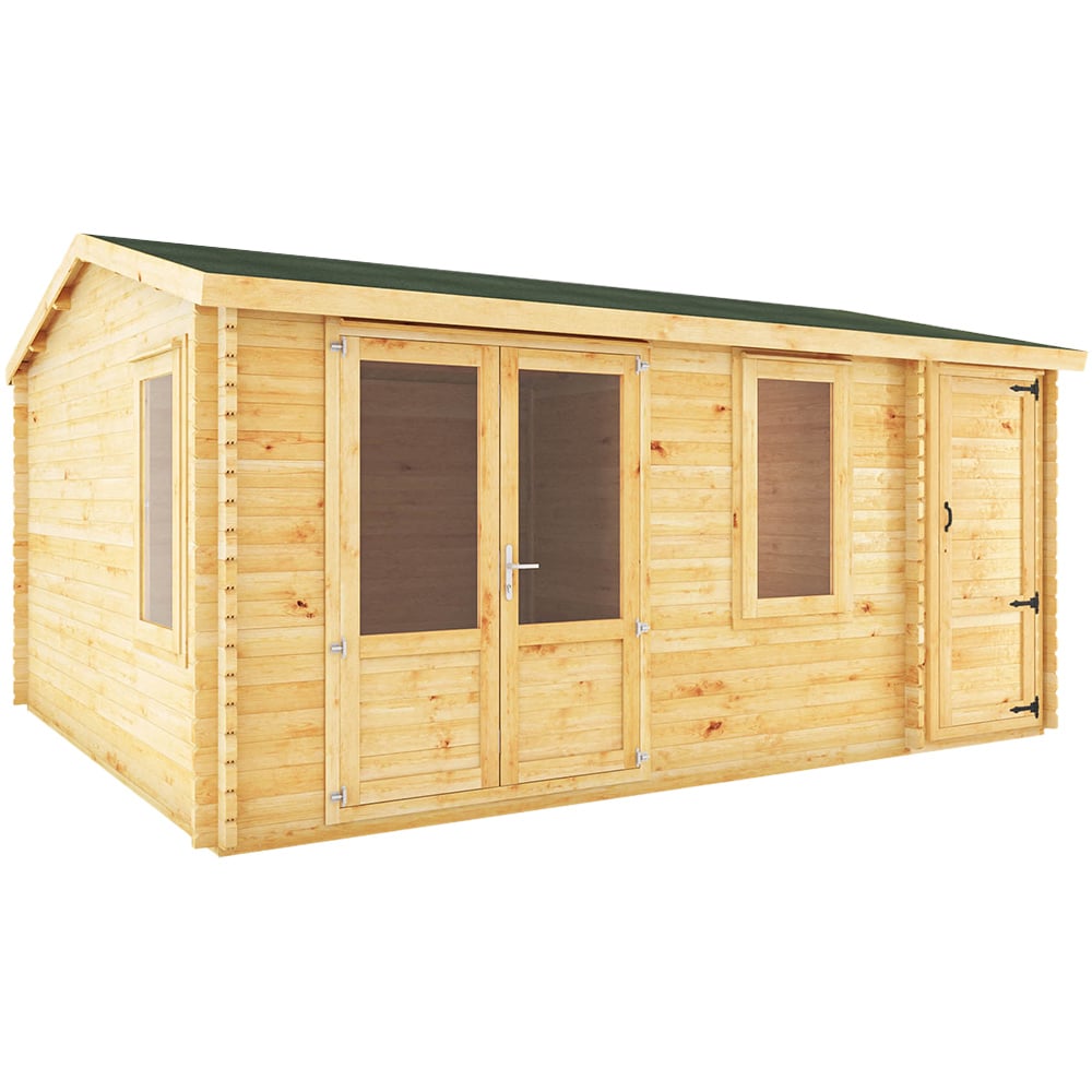 Transform your outdoor space with the Mercia 16.7 x 13.1ft Home Office Log Cabin with Side Shed. This cabin offers ample space for all your outdoor needs. Highlighted by its Alpine-inspired apex roof and delightful opening windows, effortlessly blends with any outdoor setting. The traditional apex roof design creates an airy interior, allowing it to accommodate taller furnishings and decor. The expansive windows and double doors allow natural light into the interior, creating a bright atmosphere. The additional practical side shed creates additional storage space. Features: Constructed from sturdy tongue and groove boards, the log cabin features robust panels that ensure durability and stability. The interlocking panels provide additional strength, while premium roofing safeguards the cabin from all weather. Enhanced ventilation is provided by an additional vent, reducing the risk of moisture buildup. The contemporary yet timeless ironmongery adds a stylish finishing touch. The 10-year anti-rot guarantee offers peace of mind. To maintain the guarantee, annual wood treatment is required to prevent fungal attacks. Supplied with a secure mortise lock and key, you can be confident in the security of your new building. You can opt for a Home Installation Service, where our expert installers will construct your cabin. In case the construction is to be done yourself, the cabin will be delivered as individual tongue and groove timber lengths, ready to be assembled on a firm and level base.