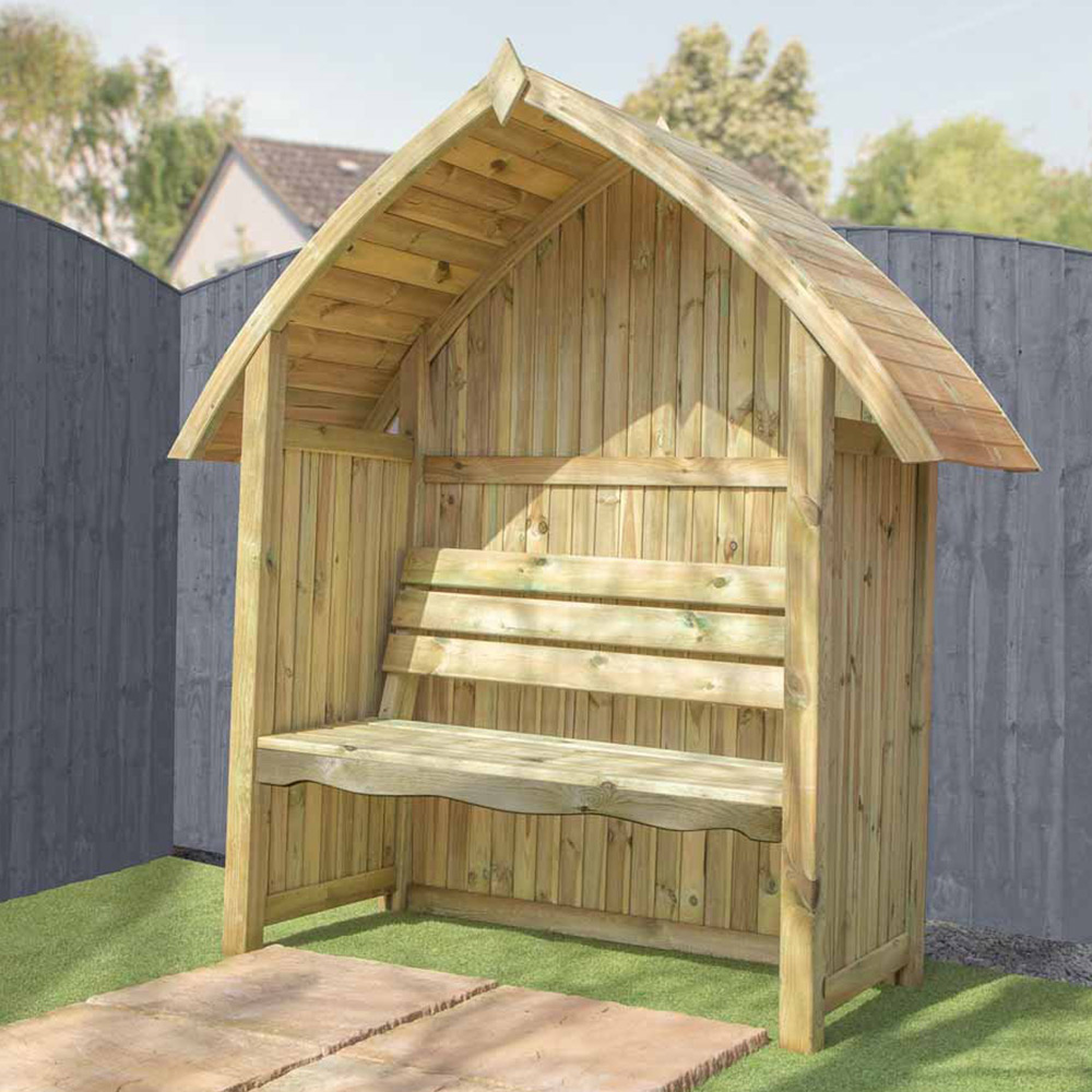Make the perfect seating addition to your garden, patio or lawn with the Mercia Arch Top Arbour Seat. After a long day, you can sit back and relax as you admire the beauty of the garden or outdoor space. Featuring a beautiful arch-top roof and an enclosed panelled back and sides, this arbour seat gives you protection from the elements all year round whilst maintaining an outdoor feel. The timber of this seat is pressure treated, a process where a preservative chemical is forced deep into the fibres of the wood under pressure. This ensures the timber is protected against insect attack and natural decay. As this arbour seat has been pressure treated it benefits from the 15-year anti-rot guarantee. Just be sure to treat your seat with a waterproof top coat and your guarantee will be good to go. It is also recommended that your seat be constructed on a firm, level base. Protect your garden furniture with our durable and waterproof covers. Explore our wide range of heavy-duty Garden Furniture covers to find the perfect fit for your needs.