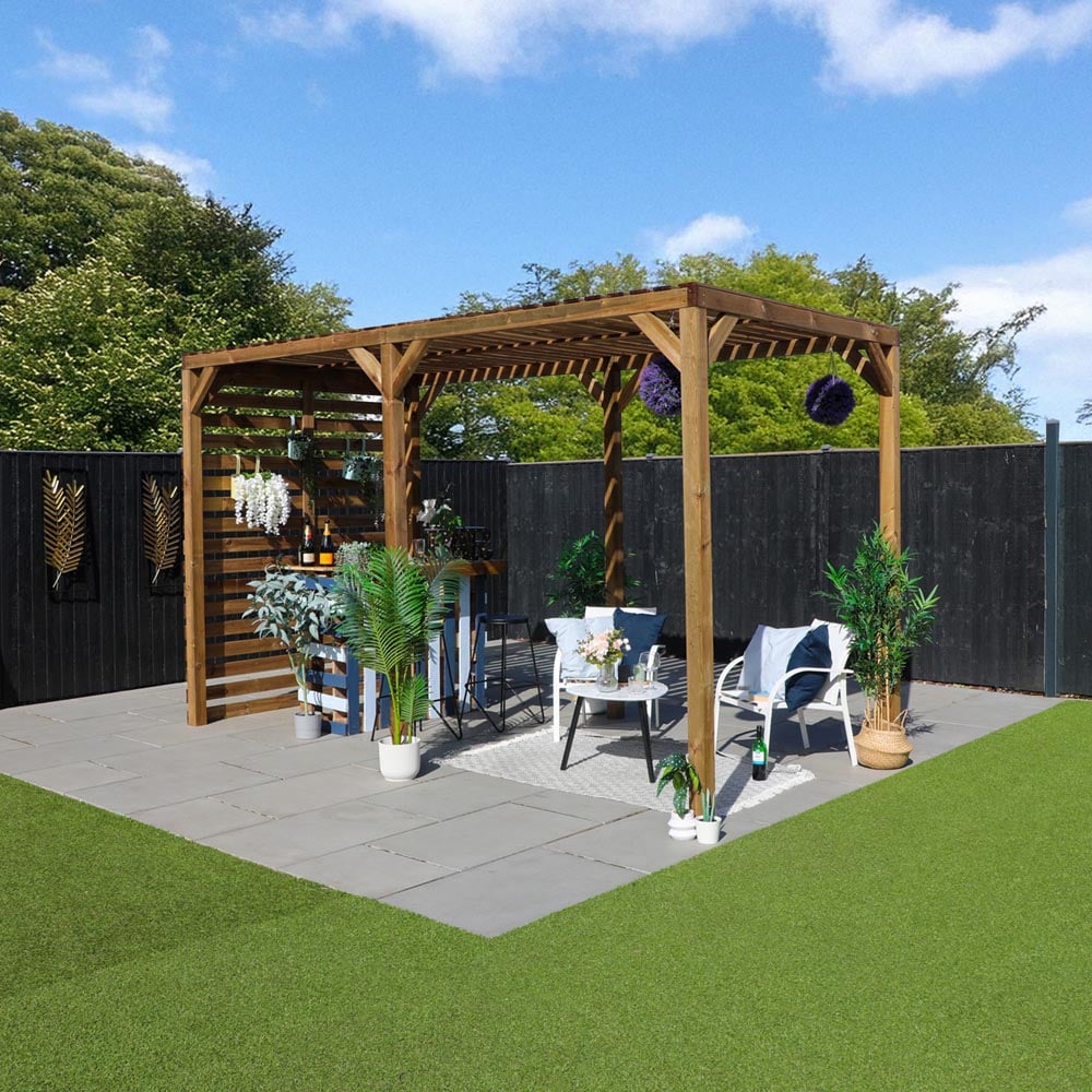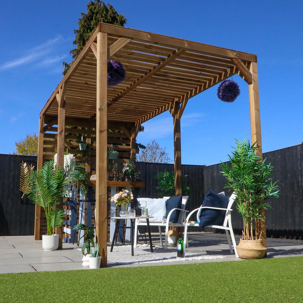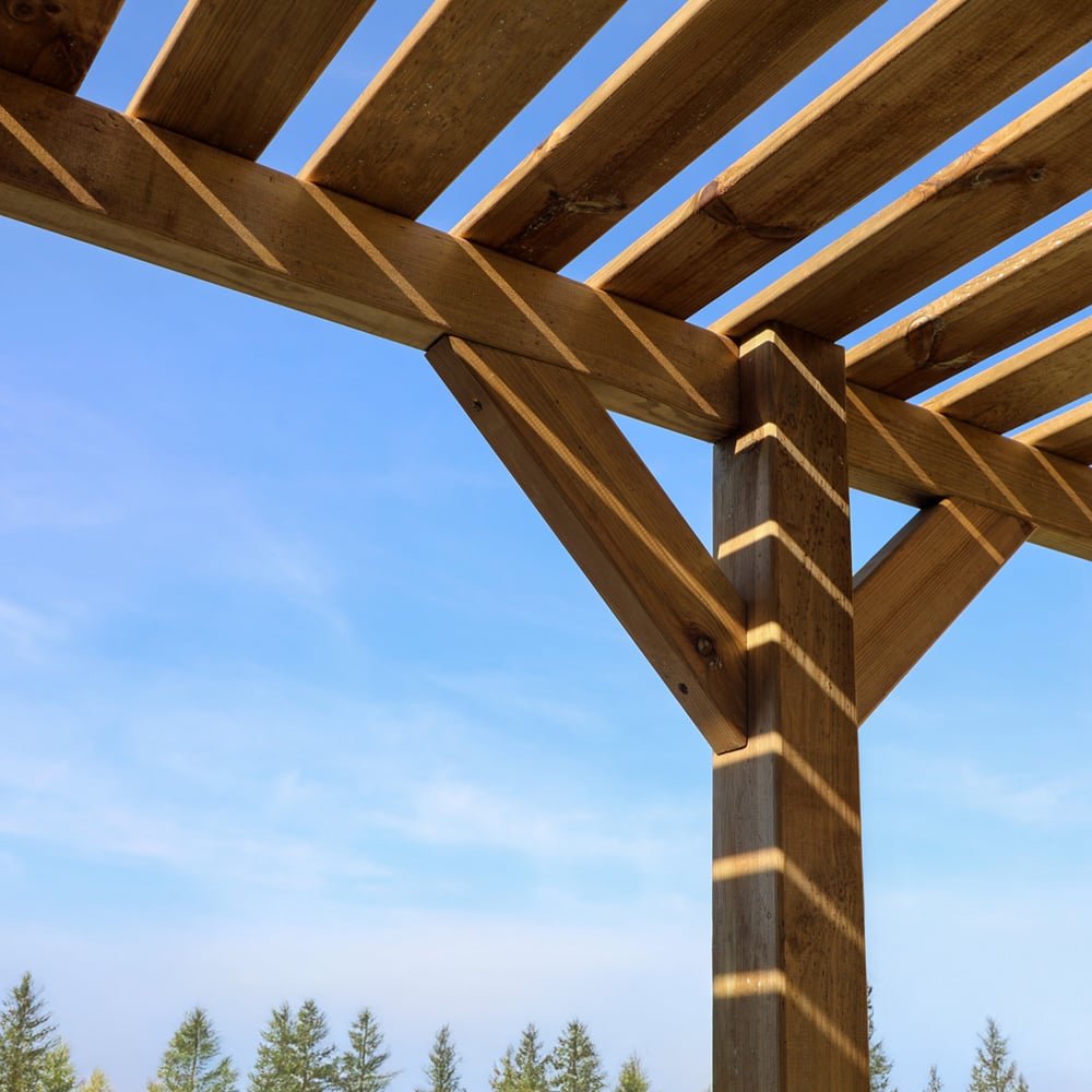 The Mercia 4m x 2m Pergola makes an attractive and multi-functional addition to any garden. These versatile structures provide the perfect frame for an al fresco dining area or outdoor relaxation space. Wooden beams help to keep the area shaded from intense sunlight and allow for the addition of decorations and climbing plants to further enhance the shelter and visual appeal. Constructed with robust 3.5x3.5” posts and interlocking 1.5x5” beams, this secure and sturdy structure is designed to stand the test of time. Mercia pergolas are manufactured to be constructed quickly and easily so you and your family can enjoy and relax in your garden in no time! All Mercia pergolas are manufactured using sustainably sourced and regulated timber. the pergolas are pressure treated which not only protects the timber against rot, decay and insect damage, but also provides a 15 Year Anti-rot Guarantee! (Waterproof treatment upon construction and annually thereafter is required.) This structure requires construction upon delivery and must be assembled on a firm and level base.