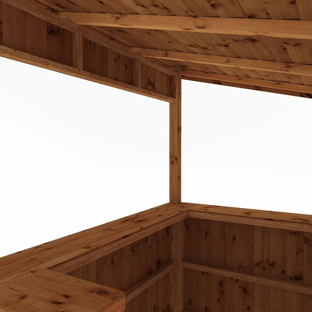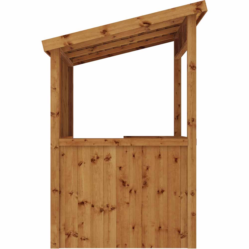Add some fun and life to your garden with a modern and stylish Mercia 4 x 6 garden bar. Perfect for hosting family and friends, this bar will become the hub of every party. Add a few stools, decorate with lights and stock with drinks to have yourself the perfect pub for entertaining all evening long. Features side access that can be set up on either side depending on the layout of your garden. And a wooden countertop, ideal for pouring and serving drinks. Manufacture in the UK, using pressure treated 12mm tongue and groove boards with a thick, 44mm x 44mm frame. Not only does that make for a robust and long-lasting build, but it looks great too. The roof formed using overlapping timber boards are nailed to an internal frame. Boasting a contemporary pent roof design allowing the rainwater to run off the back of the building, keeping the inside of the bar dry and avoid any water build-ups. The pressure treated process protects the building against insect attack and natural decay and keeps it looking fresh. The building comes with a 15-year anti-rot guarantee. This building must be constructed on a firm level base like concrete or concrete slabs.