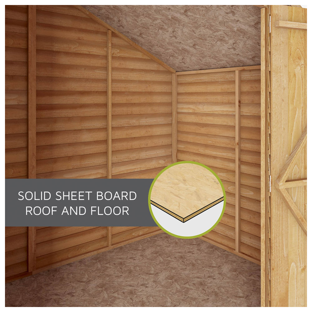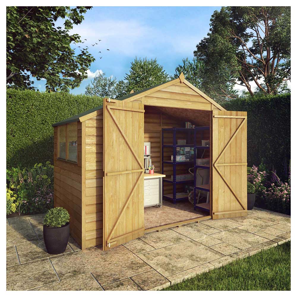 The Overlap Apex Wooden Shed from Mercia Garden offers a spacious interior and is suitable for many purposes. This building would make a great workshop, with space for garden equipment and furniture. Boasting double doors, this building provides easy access and storage of large items such as wheelbarrows and ladders. Its styrene windows allow light into the interior while being safe and shatterproof. Made in the UK, using ethically sourced, FSC®-certified timber, this building is great for those who require a shed that offers great quality with excellent value. The walls of this store are made using horizontal boards that overlap each other, this traditional method of construction creates a solid panel that encourages rainwater to run off the building, protecting your stored possessions from the elements. The solid sheet board is used to form the floor and roof, a durable material that is made up of several layers of tightly compacted oriented strands, perfect for everyday use and general storage. This building is complete with thick wooden internal framing to support the overlap panelling, creating a rigid, long-lasting structure. The traditional apex roofline provides generous head height for storing taller items and storage units. Robust roofing felt fixtures and fittings are all supplied as standard, alongside detailed instructions and manufacturer’s recommendations to ensure a simple, stress-free assembly process. It comes with an Anti-rot guarantee, to ensure your garden building looks great and lasts the test of time, this building, in particular, comes with a conditional 10-year Anti-rot guarantee as well as a 12-month manufacturer’s warranty. Annual re-treatment is required to maintain your building and the anti-rot guarantee. Size: 5 x 10ft.