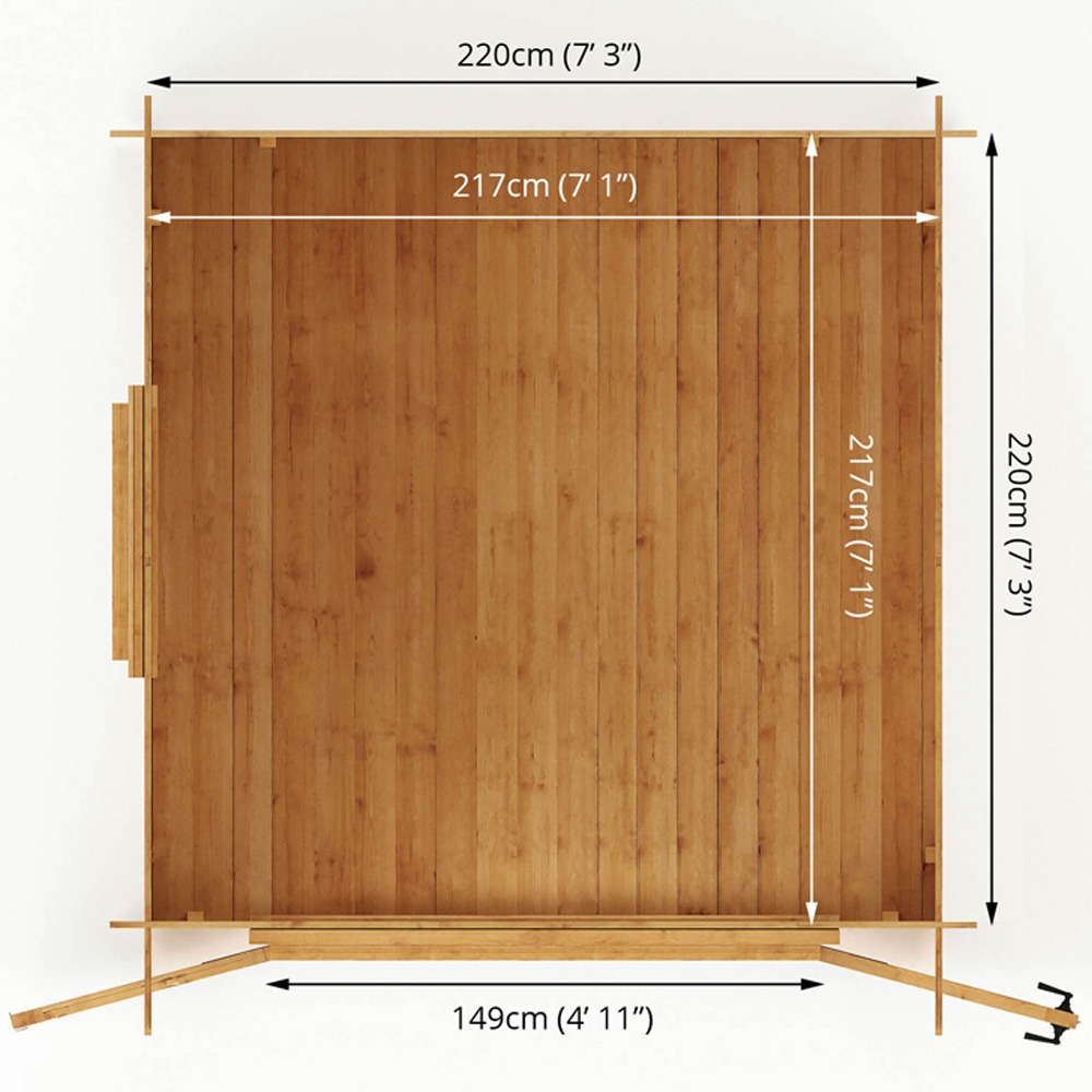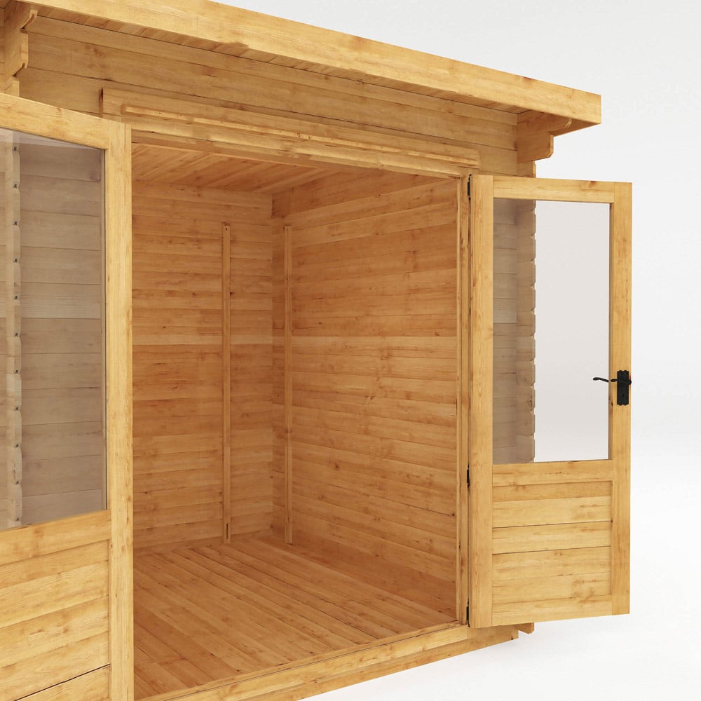 Looking for somewhere in the garden you can go to relax and unwind? The 2.4 x 2.4m Pent Log Cabin from Mercia is a compact garden room that won’t take up too much of the garden. Featuring a large opening window and half-glazed double doors, the interior is bright, airy and welcoming. With space for comfy chairs, a coffee table and shelving, this cabin is ideal as a reading or hobby room, or as a home office. The stylish and contemporary pent roof design not only looks great but will also ensure rainwater drains off the back of the building, to avoid the build-up of water. This log cabin is manufactured here in the UK, using sustainably sourced and regulated timber. The building is constructed using high-quality, the 19mm Baltic pine log boards, for a robust and durable finish. The boards interlock each other to form weatherproof and heat-retaining panels - allowing you to use the building all year round! The roof and floor are constructed using hard-wearing tongue and groove boards that lock together to form a heavy-duty build. The High-quality mineral felt is supplied as standard, to protect your building from the elements and increase its longevity. Plus, it is supplied antique style handles and hinges as well as a lock and key for the door, to keep your building secure when not in use. The glazing on this cabin is made using high-strength SAN styrene, a safe and shatterproof alternative to glass. The cabin is supplied untreated and will require a coat of high-quality timber treatment once installed. The log cabin will be delivered as individual tongue and groove timber lengths and should be constructed on a firm and level base.