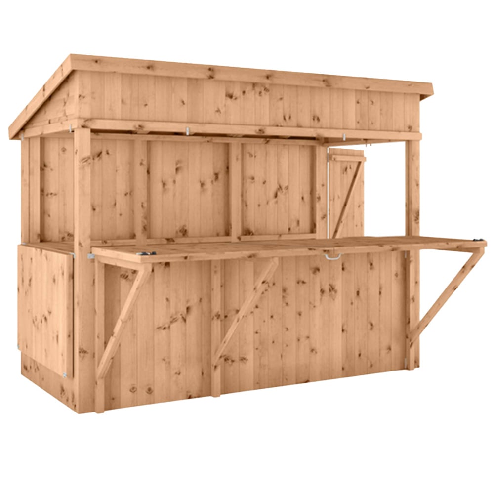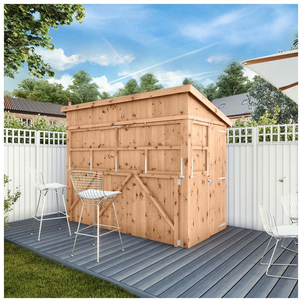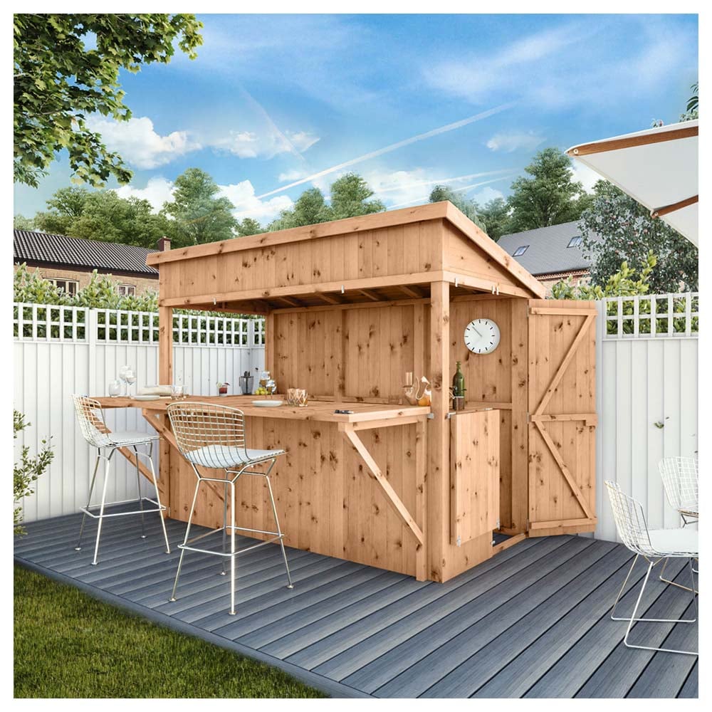 Add some fun and life to your garden with this modern, stylish Mercia 9 x 4ft Overlap Pressure Treated Garden Bar with Side Access. This shed is perfect for hosting family and friends. Add a few stools, decorate with lights and stock with drinks to create a perfect space for entertainment. This wooden bar features side access that can be set up on either side, depending on the layout of your garden or as a wooden countertop. It is made in the UK, using pressure treated 12mm tongue and groove boards with a thick 44mm x 44mm frame for sturdiness. The roof is formed using overlapping timber boards to weatherproof to prevent water entry. It comes with a 15-year anti-rot guarantee, but an annual water-based treatment is needed.