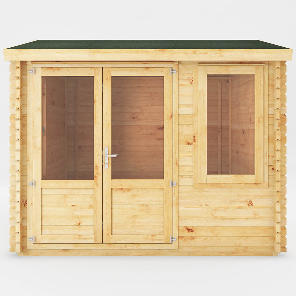 Transform your outdoor space with the Mercia 9.8 x 9.8ft Corner Log Cabin. This cabin offers ample space for all your outdoor needs. Highlighted by its Alpine-inspired apex roof and delightful opening windows, effortlessly blends with any outdoor setting. The traditional apex roof design creates an airy interior, allowing it to accommodate taller furnishings and decor. The expansive windows and double doors allow natural light into the interior, creating a bright atmosphere. Features: Constructed from sturdy tongue and groove boards, the log cabin features robust panels that ensure durability and stability. The interlocking panels provide additional strength, while premium roofing safeguards the cabin from all weather. Enhanced ventilation is provided by an additional vent, reducing the risk of moisture buildup. The contemporary yet timeless ironmongery adds a stylish finishing touch. The 10-year anti-rot guarantee offers peace of mind. To maintain the guarantee, annual wood treatment is required to prevent fungal attacks. Supplied with a secure mortise lock and key, you can be confident in the security of your new building. You can opt for a Home Installation Service, where our expert installers will construct your cabin. In case the construction is to be done yourself, the cabin will be delivered as individual tongue and groove timber lengths, ready to be assembled on a firm and level base.