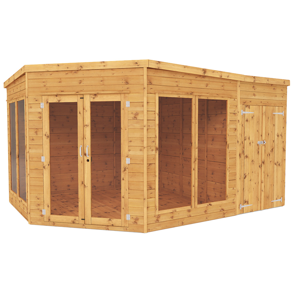 The Mercia 13 x 9ft Corner Summerhouse with Side Shed is a stylish and practical garden building, perfect for those looking to extend their living space into the garden. With the addition of the side shed, this summerhouse ticks all of the boxes. This wooden summerhouse is designed to maximise your space by sitting comfortably in the corner of your garden, while giving you fantastic panoramic views. Fitted with four fixed windows and double doors, all glazed with styrene, the interior is bright and airy. The doors are fitted with stylish brushed chrome effect handles and hinges, as well as a lock and key. Manufactured here in the UK, using sustainably sourced and regulated timber, you can be confident in the quality of your new garden building. The walls are constructed using 12mm Shiplap tongue and groove cladding to form strong, hardwearing and weather resistant panels. Heavy-duty tongue and groove boards are used to construct the roof and floor, for a strong and heavy-duty finish. The roof is covered with high grade mineral felt for added weatherproof protection. Complete with thick wooden framing to support the cladding internally, this building offers a rigid and long-lasting structure.