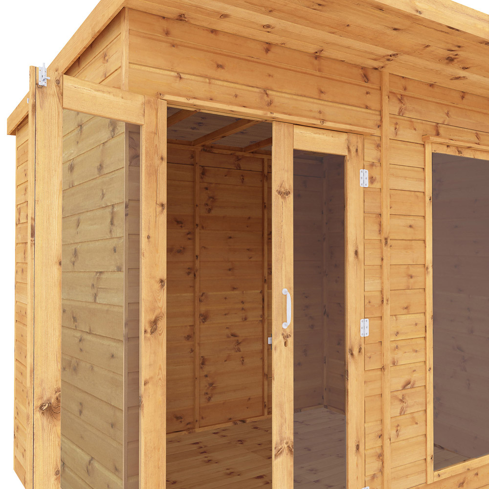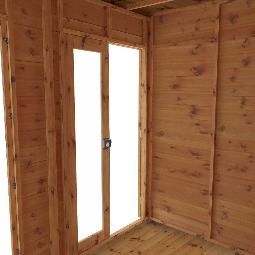 Sit back and relax inside the Mercia 8 x 6ft Shiplap Maine Summerhouse. With fully glazed French doors and a fixed full-length window, the interior of this summerhouse is bright, airy and welcoming. The doors of this shed are finished with brushed chrome handles and hinges for a contemporary aesthetic. Fill the space with comfy chairs, a coffee table and some indoor plants to create the perfect garden retreat. Made in the UK using ethically sourced, FSC-certified timber, this store is great for those looking for a secure storage solution offering excellent value. It comes with a 15-year anti-rot guarantee. Annual re-treatment is required to maintain your building and anti-rot guarantee.