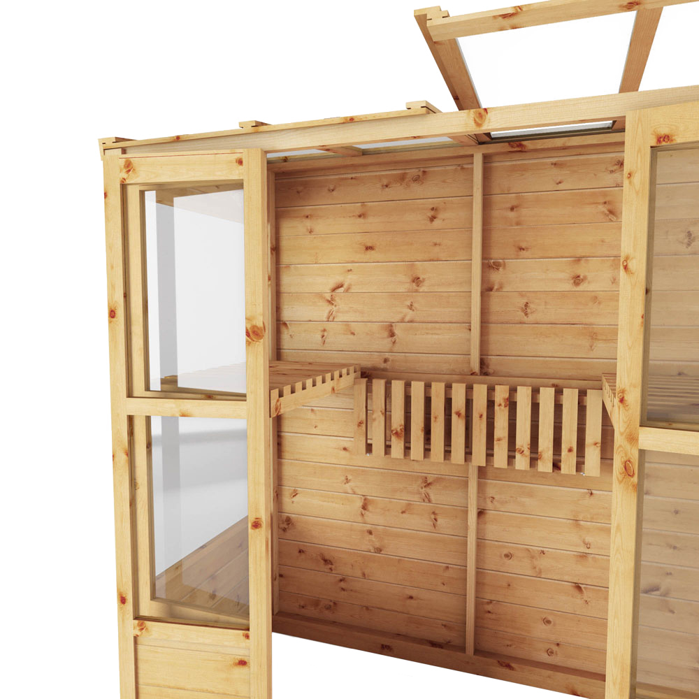 Our traditional, compact grow house is perfect for those with smaller gardens or who only require a small space for potting produce and storing gardening tools. Made from quality materials this greenhouse will look great and stand the test of time. This garden building benefits from internal potting shelves and is great for growing a range of vegetables and flowers all year round. Heavy-duty tongue and groove boards are used to construct this greenhouse. Using an interlocking method, the boards lock together to create a premium, strong and hard-wearing finish. Complete with thick wooden framing to support the cladding internally, this building offers a rigid and long-lasting structure. The glazing is made of UV resistant styrene, which allows maximum light into the greenhouse while being safe and shatterproof. No floor is supplied with this greenhouse to ensure water can drain easily after you have watered your produce. All fixtures and fittings are supplied as standard, alongside our detailed instructions and our manufacturer’s recommendations, to ensure a simple and stress-free assembly process. Ethically sourced FSC® certified timber it comes with a 10-year anti-rot guarantee and a 12-month manufacturer’s warranty. Annual re-treatment is required to maintain your building and the anti-rot guarantee.