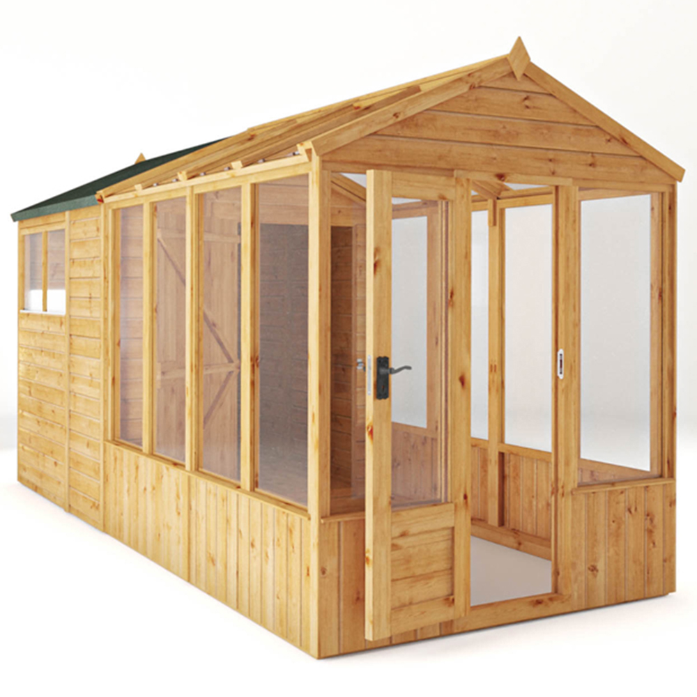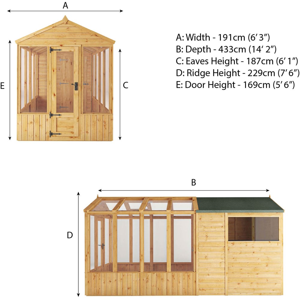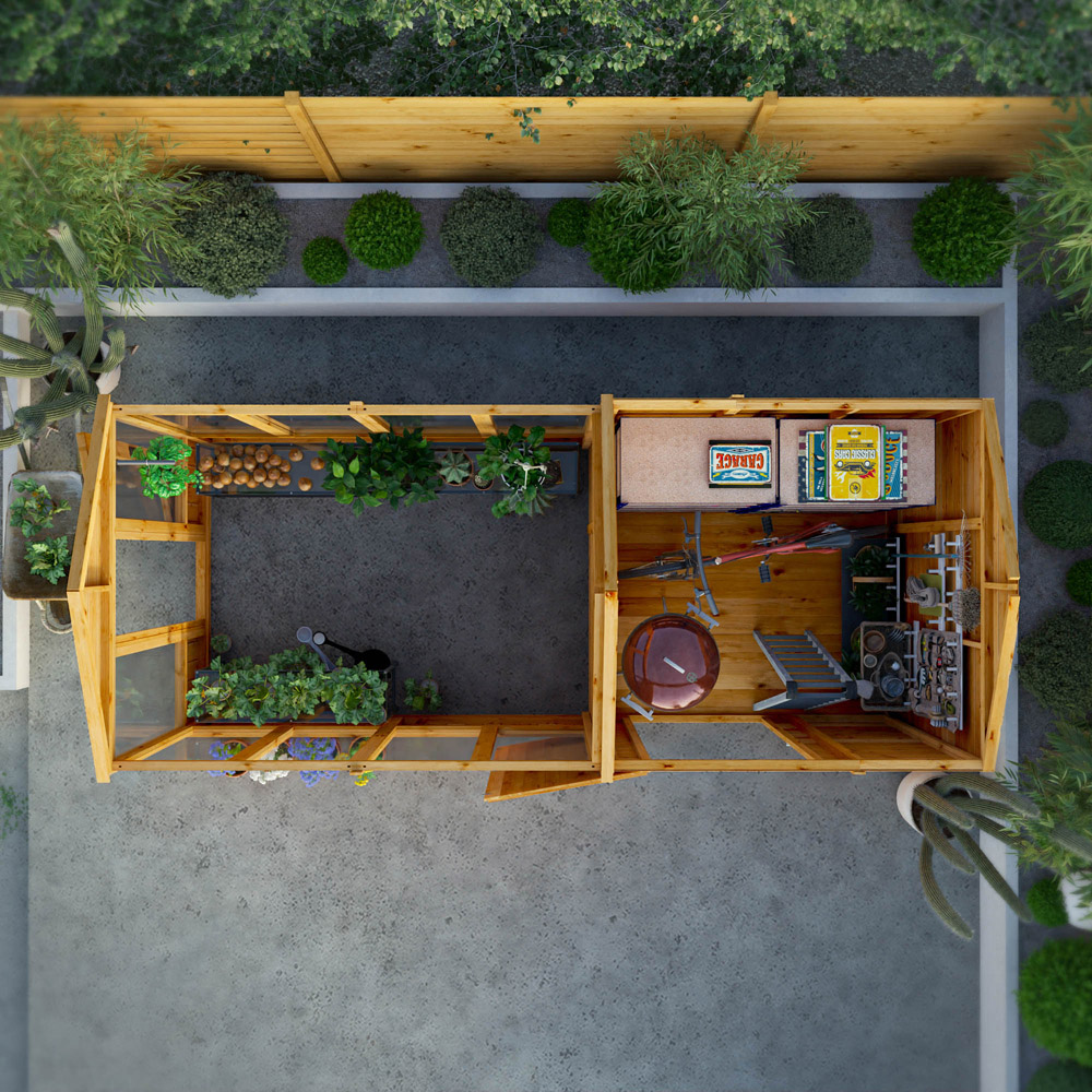 Maximise your outdoor space and gardening potential with the Mercia 14 x 6 Woodsman Styrene Greenhouse/Shed Combi, the largest option in the Woodsman greenhouse and shed range. This generously sized structure provides ample room for both growing plants and storing garden tools, equipment, and supplies, making it the perfect choice for those who need extra space but want to keep everything neatly organised in one practical unit. Ideal for larger gardens, this combi greenhouse and shed offers incredible versatility in a compact footprint. The styrene glazing offers a durable, affordable solution for protecting your plants, allowing plenty of natural light to filter through while ensuring solid weather protection. While it may not offer the premium durability of glass or polycarbonate, styrene provides a practical and cost-effective option for those seeking a reliable greenhouse that delivers great value. The premium 2" x 2" framing ensures strength and stability, making it a robust structure that will support both your gardening needs and storage requirements for years to come. The greenhouse section is designed to provide the perfect environment for plant growth, with an opening roof vent that helps regulate airflow and temperature, ensuring your plants thrive. The shed section offers generous storage space for tools, pots, and gardening accessories, keeping everything organised and easily accessible. The high-quality ironmongery adds a traditional touch of style, while the watertight shiplap cladding ensures the structure is protected from the elements, keeping both the greenhouse and shed areas dry and secure. Crafted from sustainable and certified timber, the Mercia 14 x 6 Woodsman Styrene Greenhouse/Shed Combi is built with environmental responsibility in mind. Backed by a 15-year anti-rot guarantee, you can trust that this structure is made to last and will continue to perform for many years. With easy-to-follow instructions, the assembly process is straightforward, allowing you to quickly set up your new greenhouse and shed combo and start enjoying your garden to its fullest potential. The Mercia 14 x 6 Woodsman Styrene Greenhouse/Shed Combi is the ultimate solution for gardeners looking for extra space and functionality. Whether you’re growing a variety of plants or need more storage, this large combi structure provides the perfect blend of practicality, durability, and value, making it an excellent investment for any garden.
