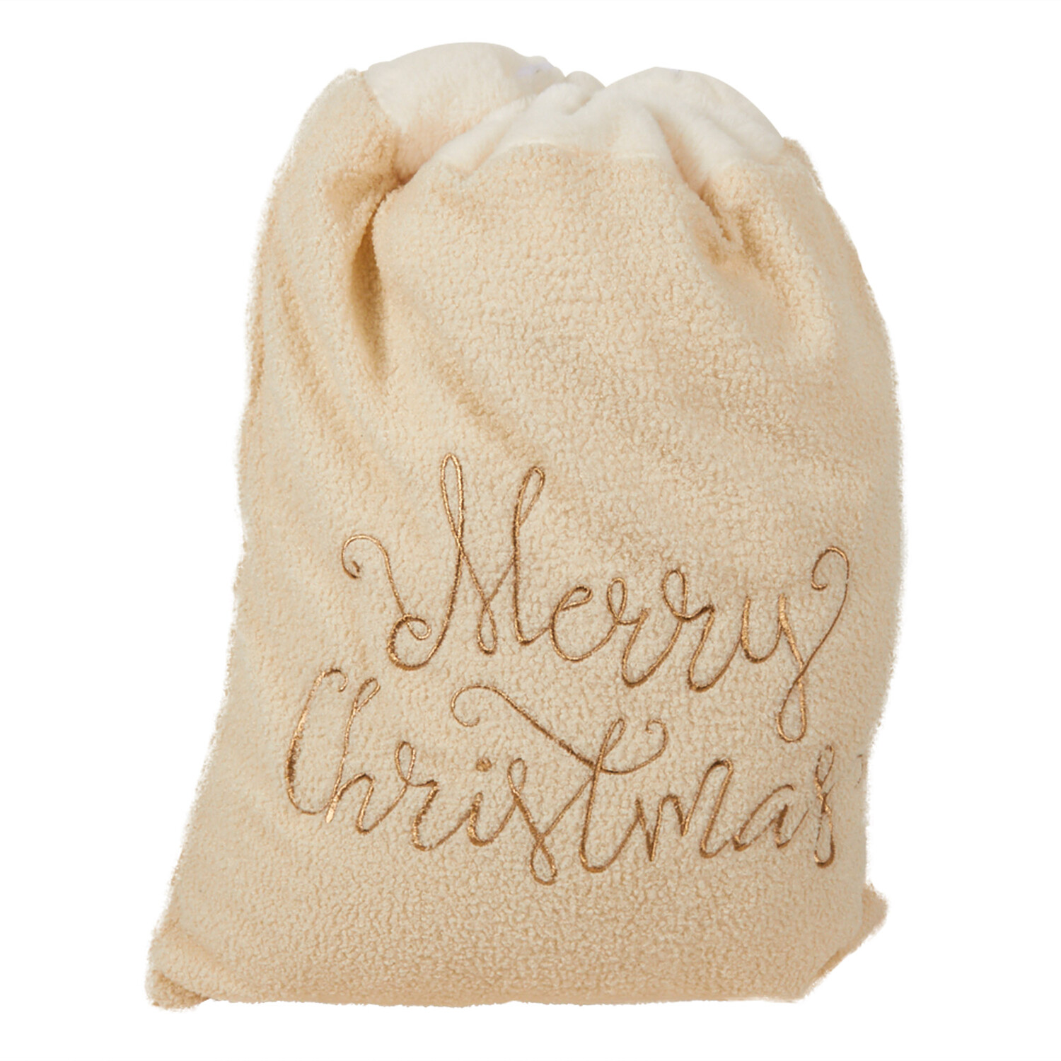 Gift in style with the Merry Christmas Neutral Boucle Sack. This soft boucle drawstring bag features a charming stitched "Merry Christmas" design, making it perfect for storing holiday gifts. Its cosy texture and pom pom detailing add a delightful touch to your holiday decor, making it an ideal addition to be placed beside the Christmas tree.