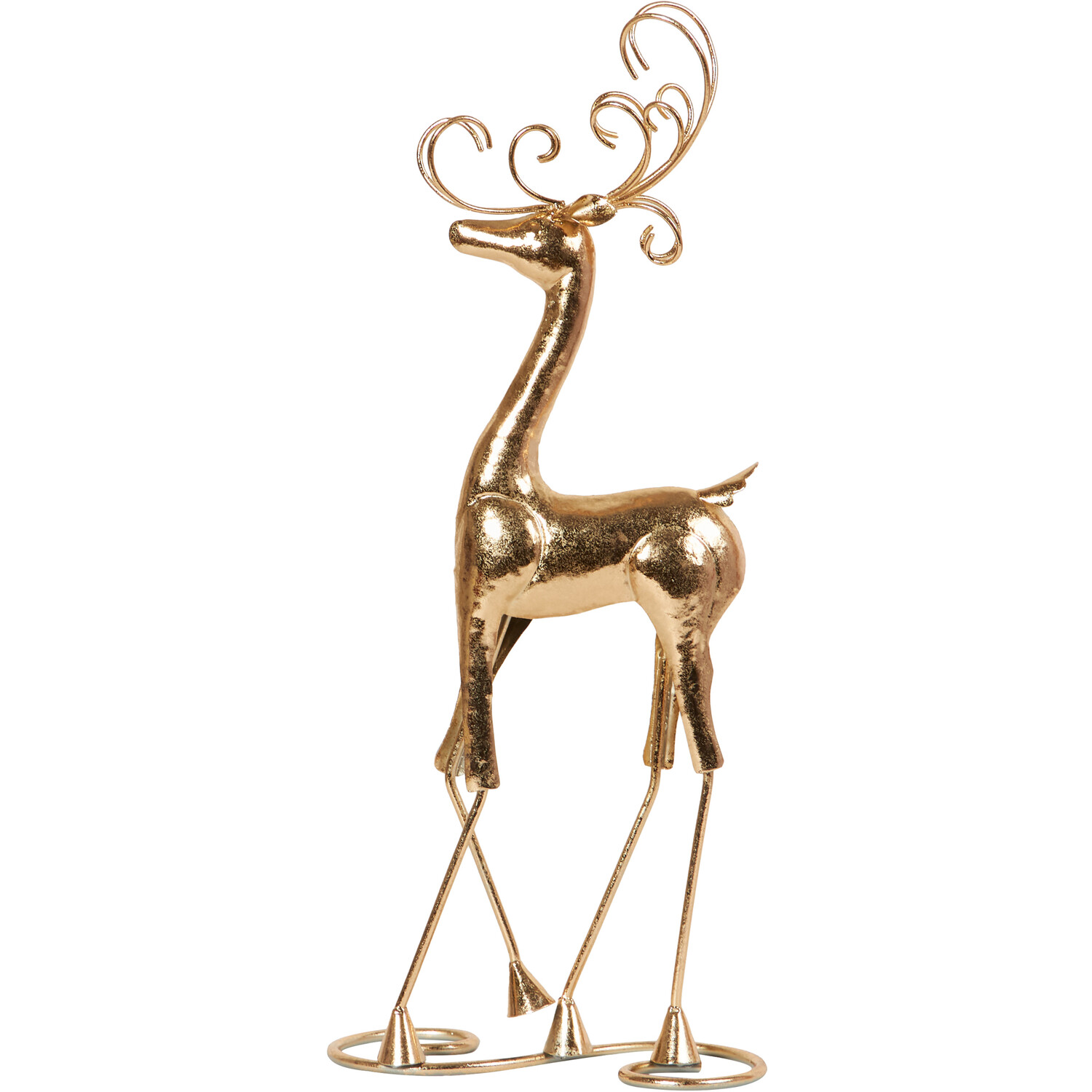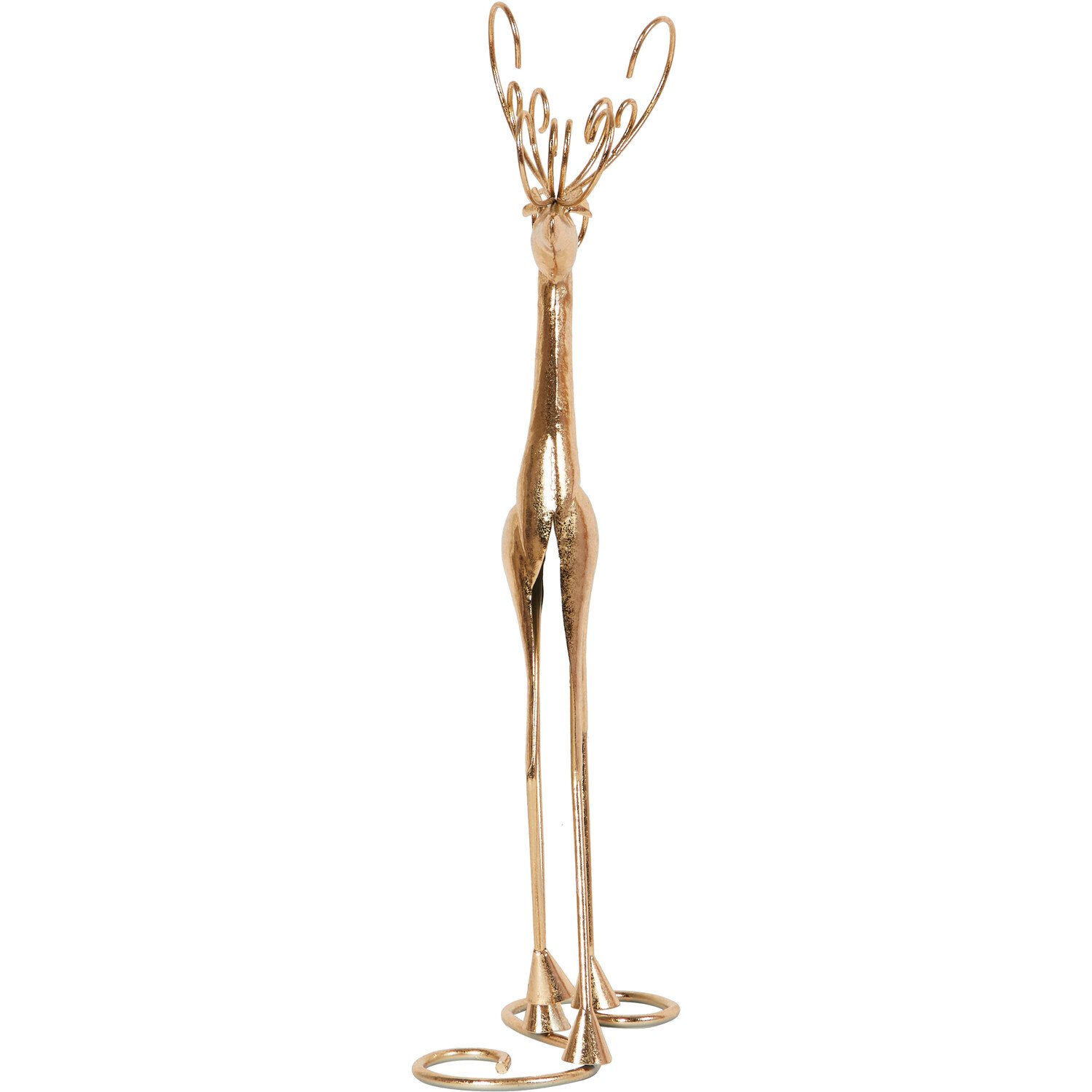 Add a whimsical touch to your holiday decor with this Metal Reindeer Ornament. This exquisite ornament features a beautiful reindeer with antlers and intricate features to capture the spirit of the season. Finished in a golden colour, this ornament will look fantastic on mantels, windowsills, console tables, and much more. Versatile and stylish, it can be used as a festive display or a perfect gift.