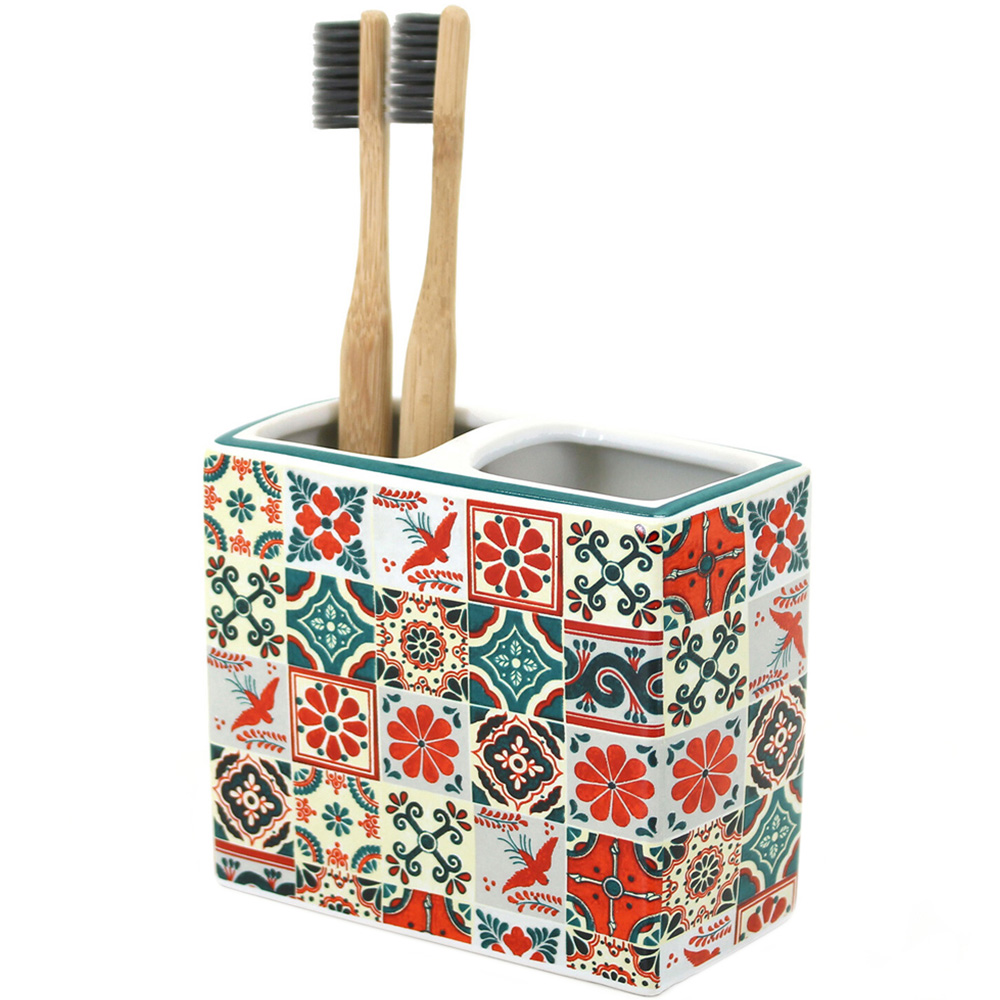 Bring an exotic feel to your bathroom with this Mexico Mosaic Toothbrush Holder. Great for keeping your bathroom neat, tidy and stylish, this toothbrush holder has two separate sections to keep your items separate. Pair it with the rest of the Mexico mosaic collection for a cohesive styled look.