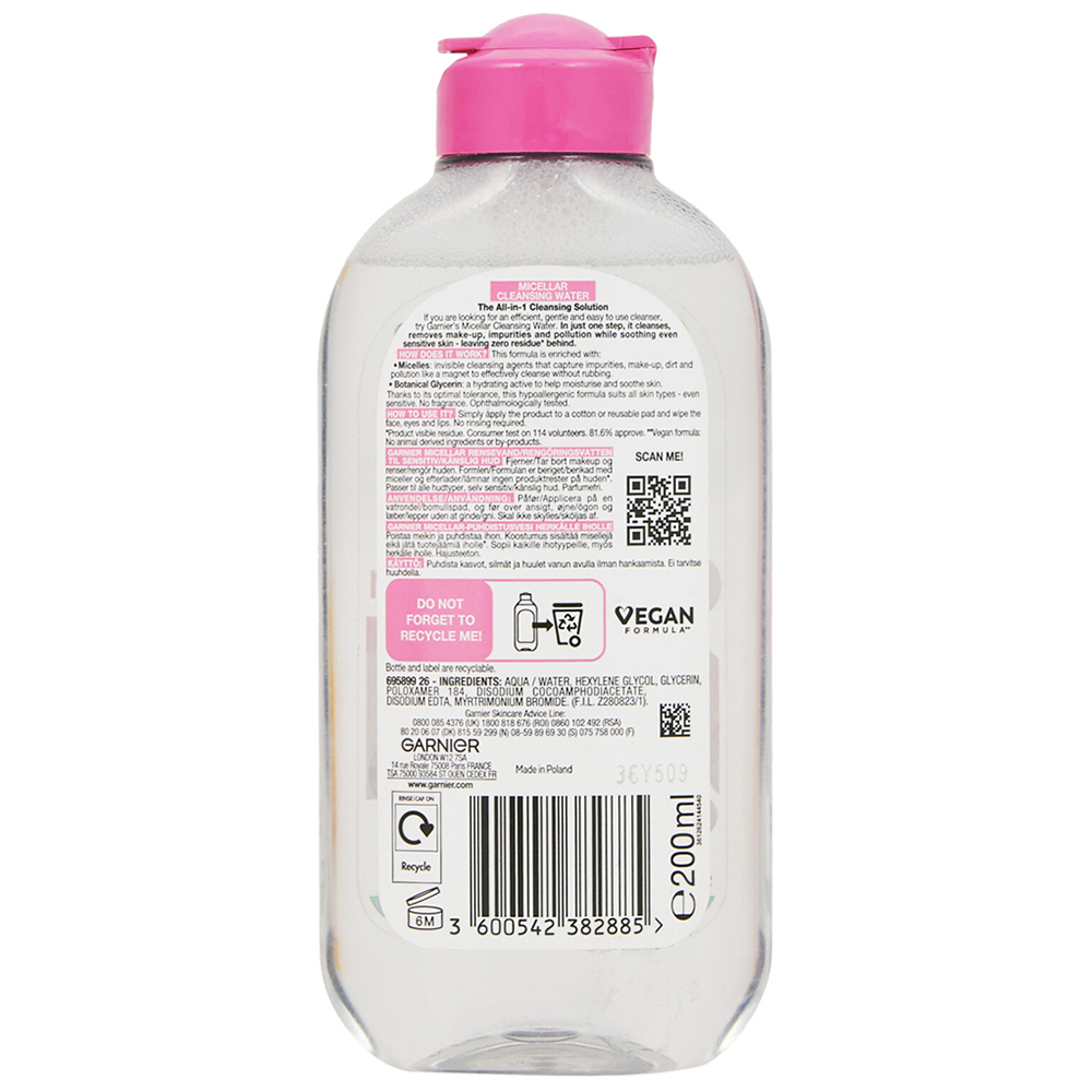 Experience effortless cleansing with Garnier SkinActive All in 1 Sensitive Skin Micellar Cleansing Water 200ml. Perfectly crafted for sensitive skin, this fragrance-free and hypoallergenic solution gently removes makeup without leaving any residue. Enjoy a refreshing clean that requires no rinsing, making your skincare routine simple and effective.