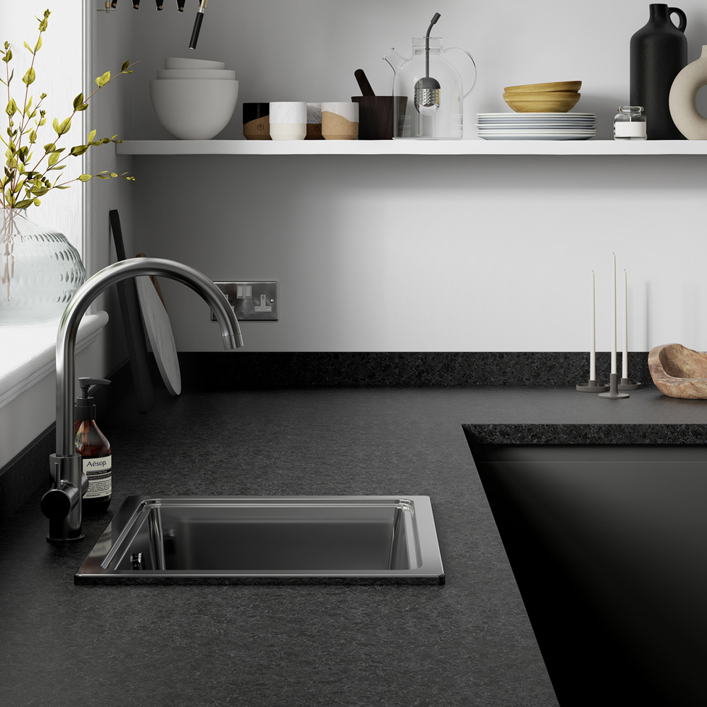Midnight Granite laminate worktop, get the luxury look of granite worktops, with all the practicality of laminate. Designed to look like granite, laminate worksurfaces are easy to work with, install and keep clean, as well as being the practical alternative to granite worktops.