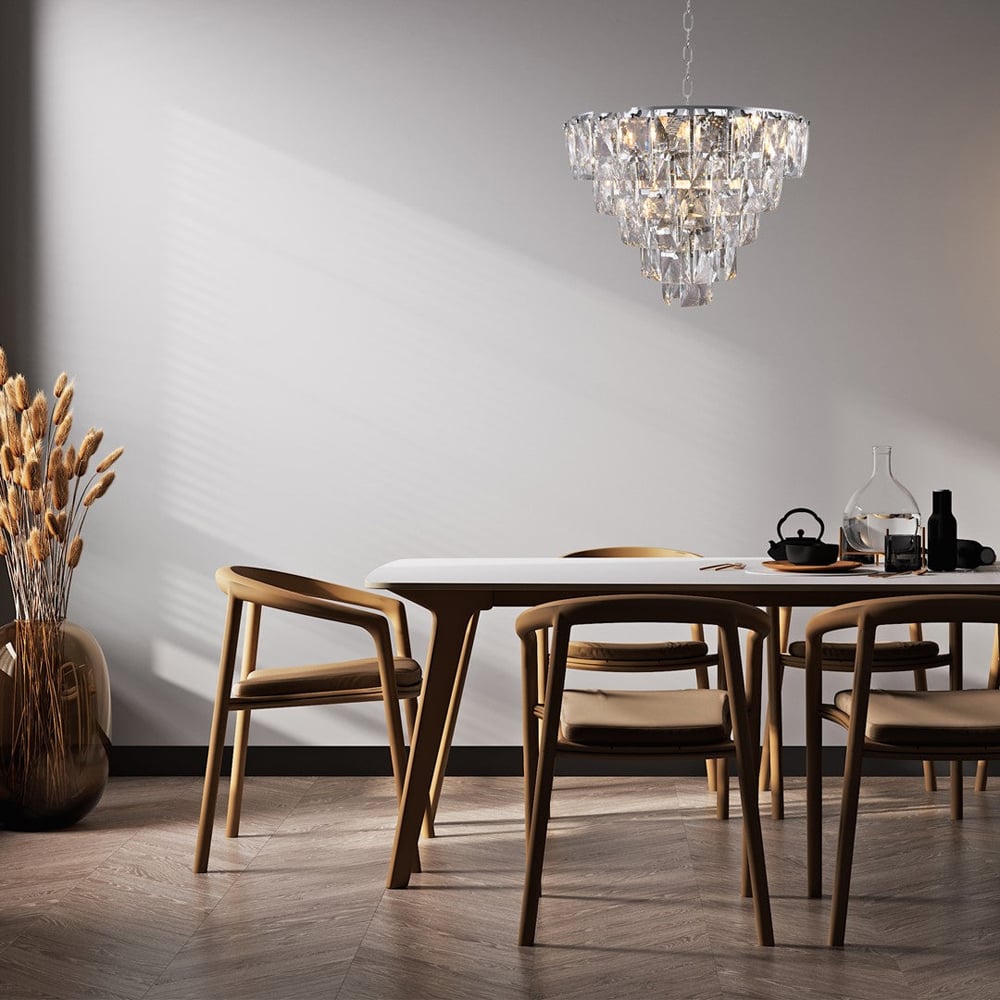 The Milagro Chelsea Chandelier is a stunning modern take on the most classic and striking of all light fittings. The magnificent, majestic chandelier is an eye-catcher in any ambience, thanks to its design and polished prisms. The Chrome and Crystal Chandelier has a diameter of 50cm and can be height adjusted from 50-100cm. Please click here to find our range of lightbulbs.