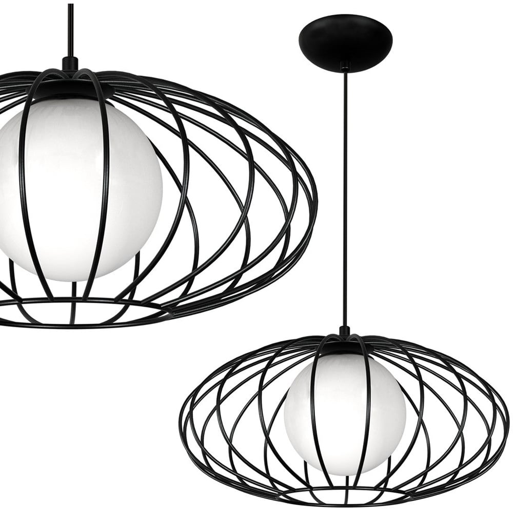 The Milagro Kronos Black Pendant Lamp is a cool pendant ceiling lamp at a great price. The 36cm wide flattened cage-like design is handmade and houses an elegant glass shade. The form and monochromic appearance make this an ideal choice for many modern interiors and also fit well where an industrial chic look is desired. Made in Poland. Voltage: 230V. Please click here to find our range of lightbulbs.