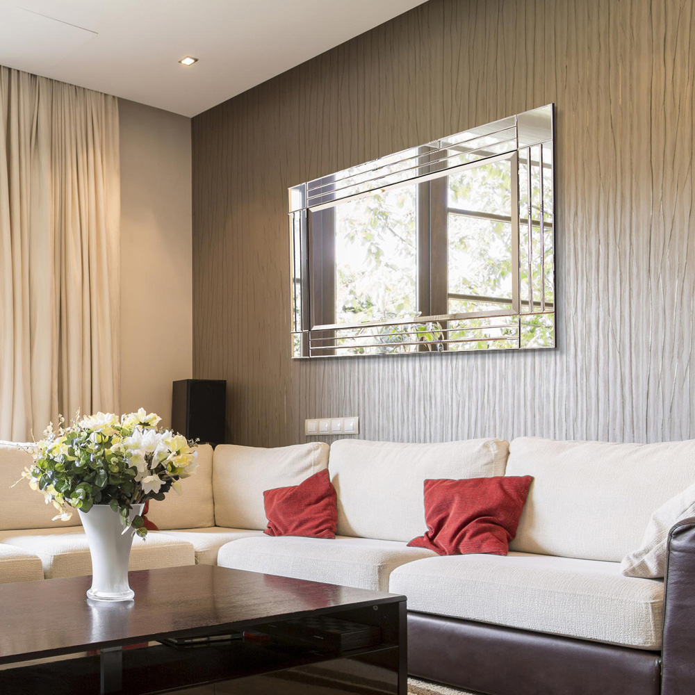 Brighten your living space with this stylish Milton Square Corner Bevelled All Glass Large Dress Mirror 120 x 80cm. It sports a Venetian style and features a bevelled glass that adds style to any room including bathrooms. It's designed with a triple silver outline and can be hung in either landscape or portrait. Plus, this mirror is supplied with two manufacturer-fitted D hooks on the back of the frame and offers a full-insured delivery to provide you with added convenience. You can hang it directly from screws in the wall at an equal distance to the centre of the D rings. Note: Do not use string, wire, or chain to hang this mirror.