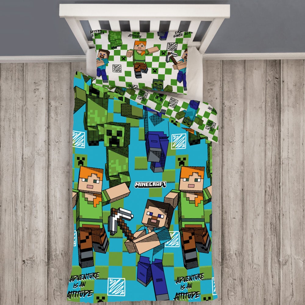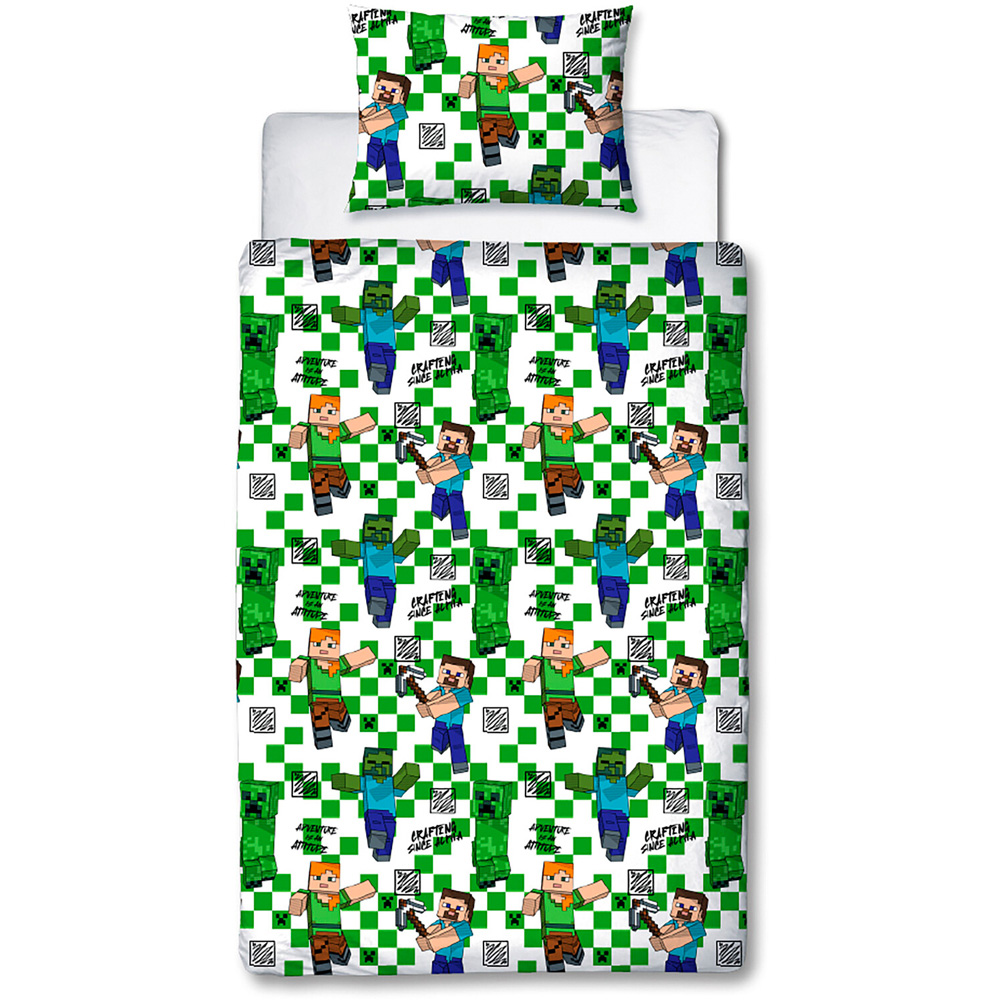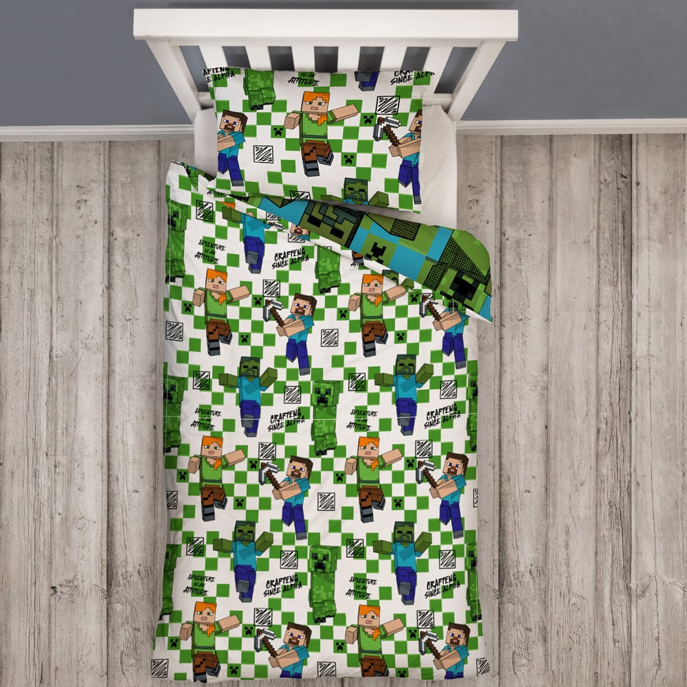 Give your little gamer a fun space to sleep with this Minecraft Drawn Single Green Duvet Cover Set. Perfect for settling down after a long day of building, this bedding set is reversible, offering two vibrant designs to choose from. Great for any Minecraft fan, this duvet cover is suitable for a single bed and comes with a matching pillowcase.